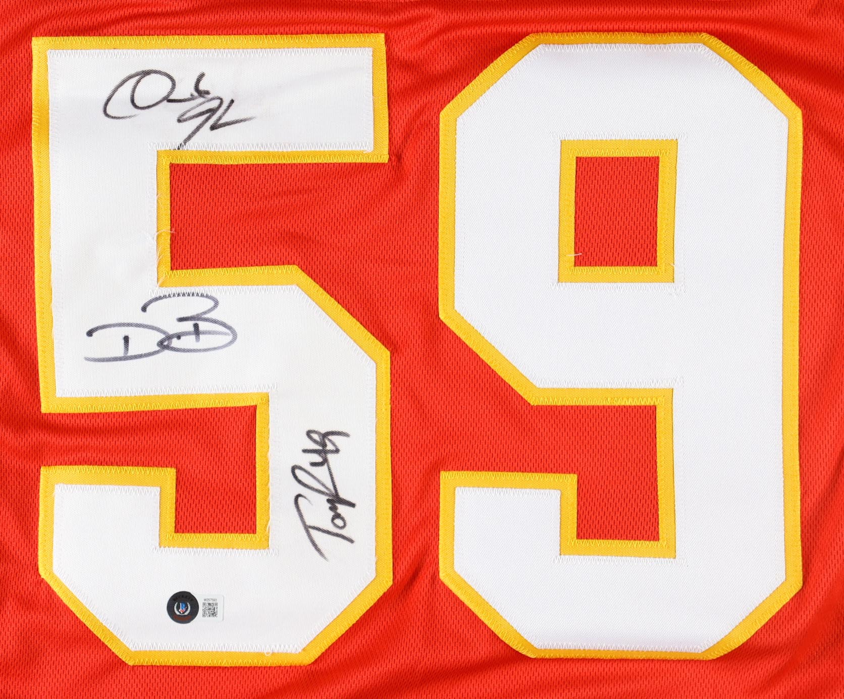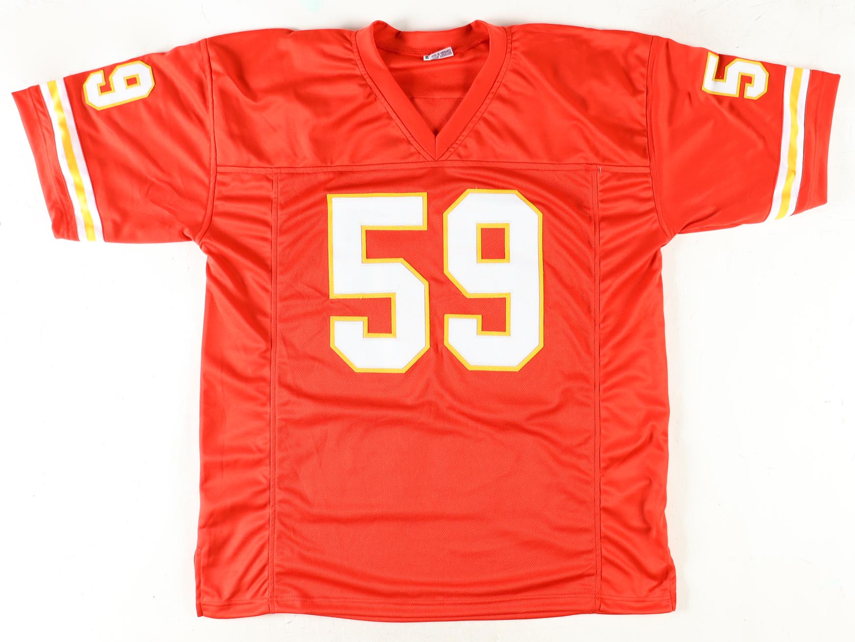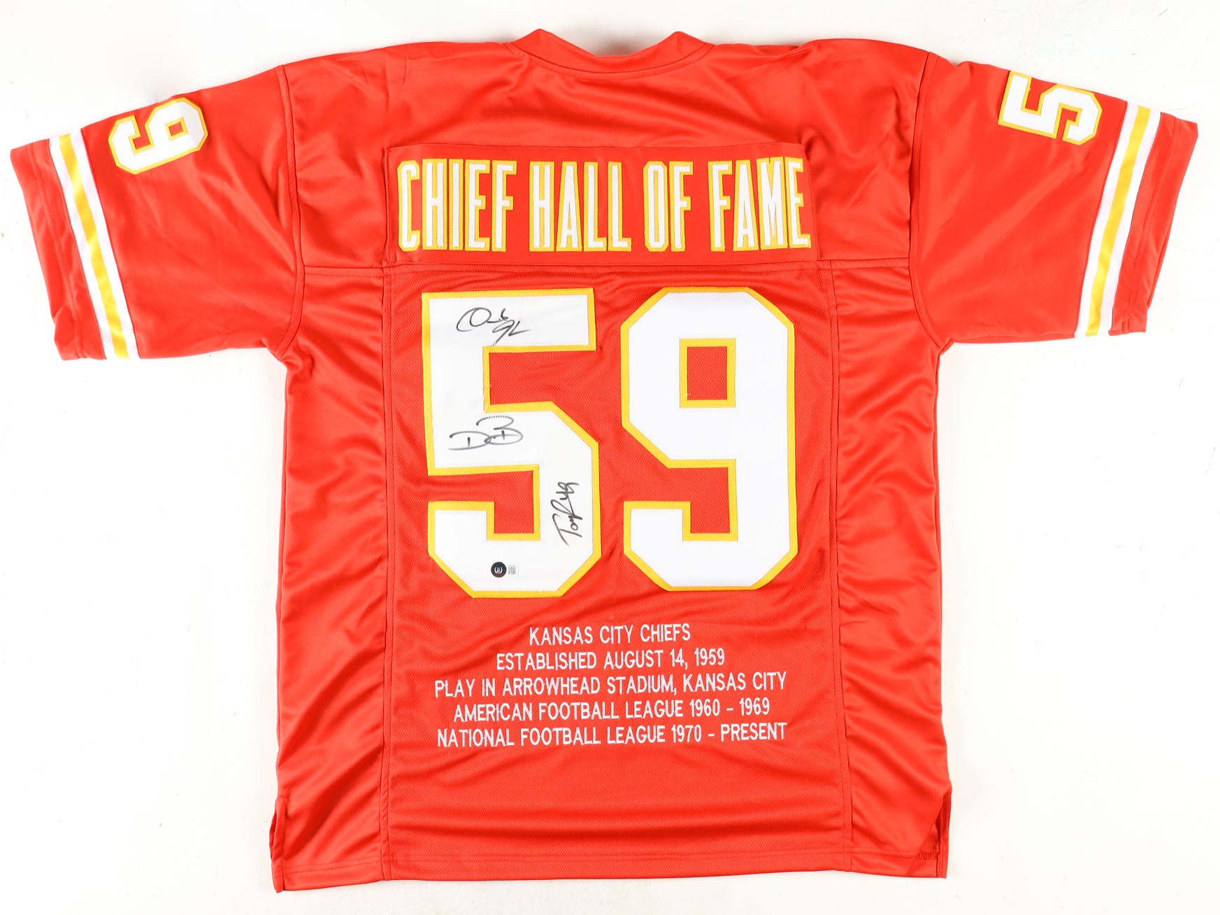 Custom jersey. Everything sewn on, size XL. Hand-signed by Dwayne Bowe, Derrick Johnson and Tony Richardson. Team highlights have been custom stitched onto the back of the jersey below the reverse numbers.