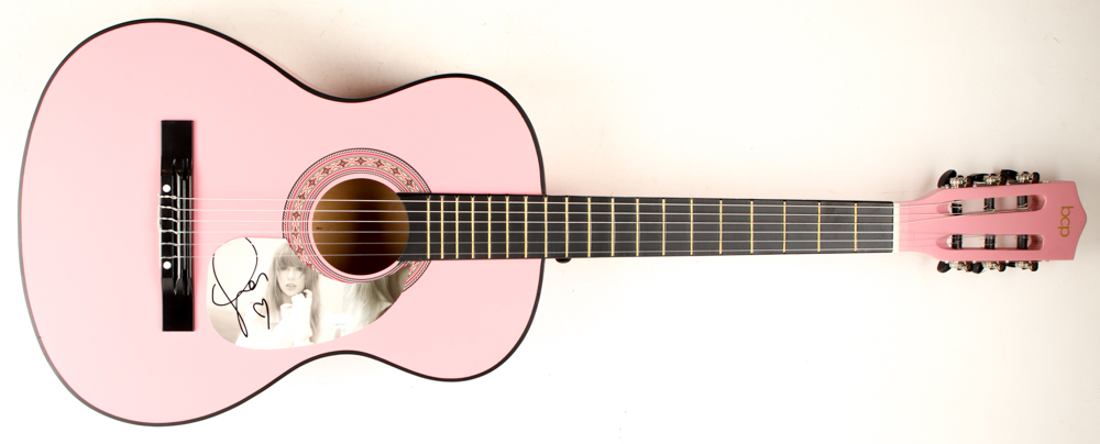 Acoustic guitar measures approximately 39" long and has been hand-signed on the pick guard by Taylor Swift.