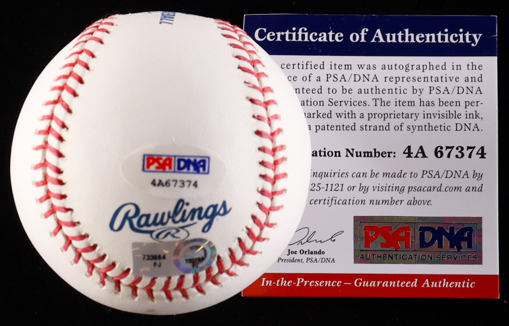 The autograph(s) includes an official MLB Authentication hologram, as well as an official PSA/DNA hologram and matching COA for authenticity purposes. The signing of this item was witnessed by PSA.