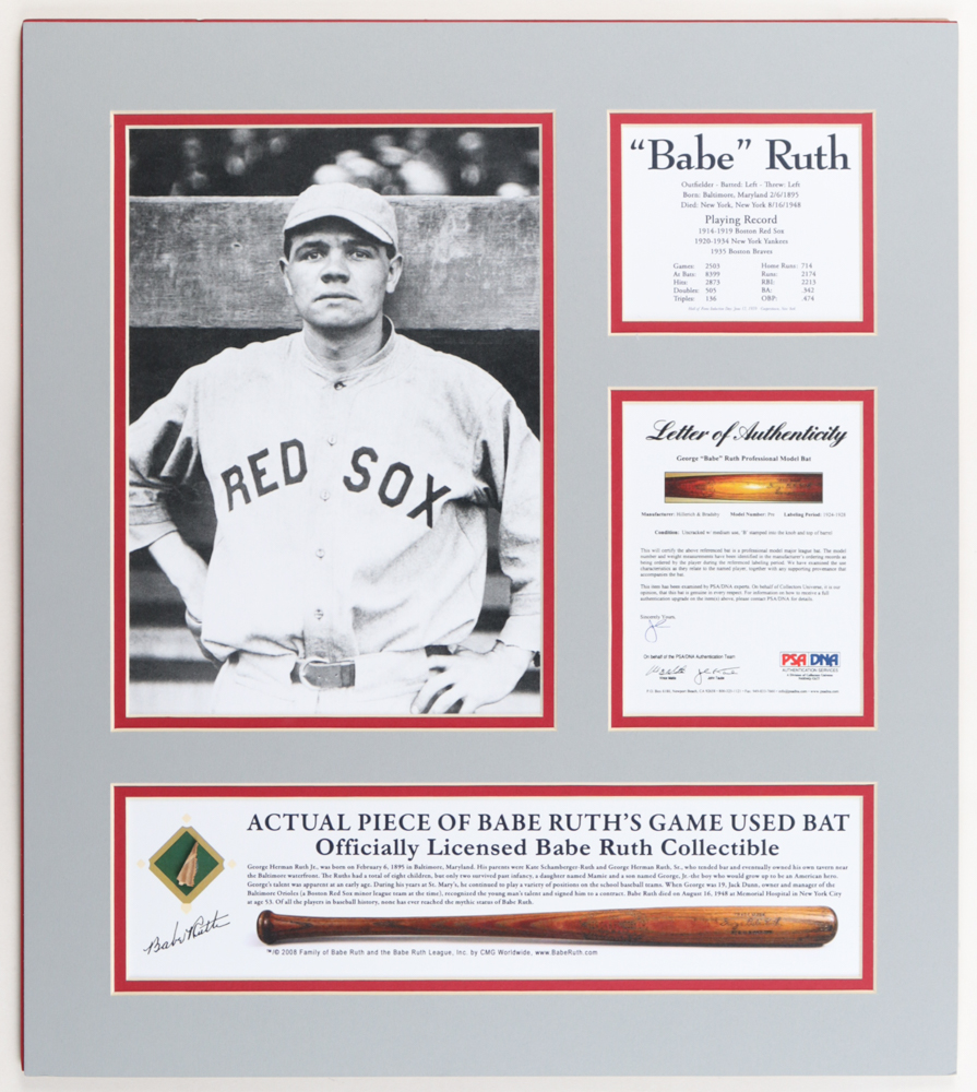 Custom matted display measures approximately 16" x 18" in size and features a piece of wood cut from a baseball bat that was game-used by Babe Ruth (D. 1948, Boston Red Sox, HOF). The PSA LOA copy is included in the display. Please note the bat piece may vary.