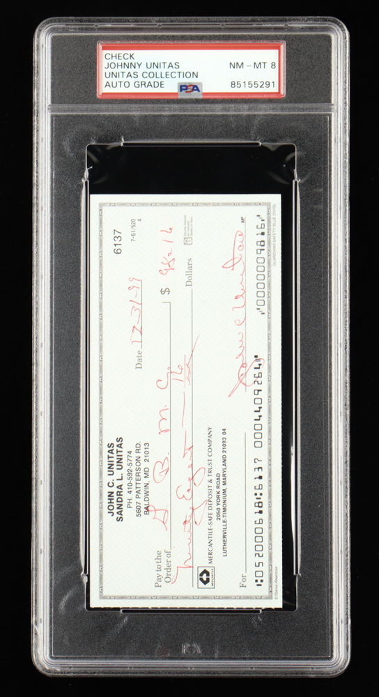 Johnny Unitas Signed 1999 Personal Check (PSA | Autograph Graded 8)