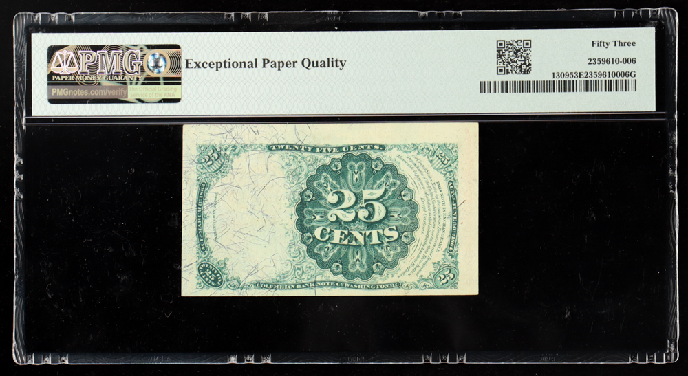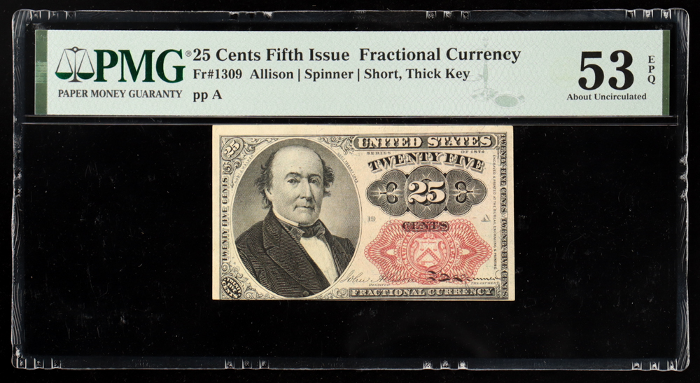 1874 U.S. .25¢ Fractional Currency Note, 5th Issue Red Seal / Short, Thick Key - Portrait: Robert J. Walker, Treasury Secretary (PCGS AU53 EPQ)
