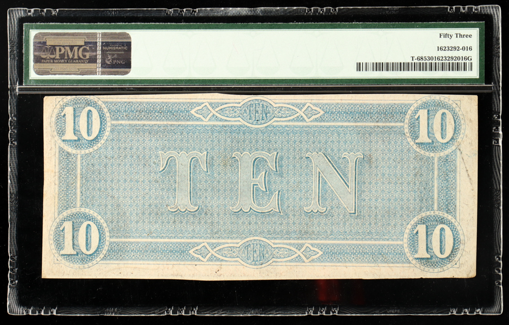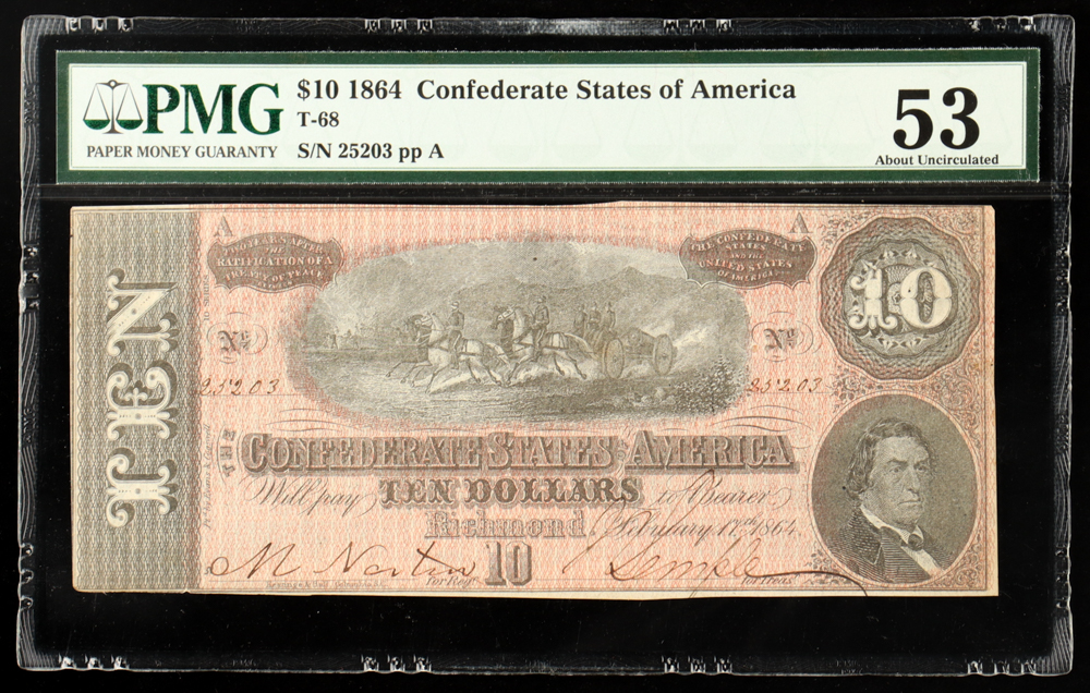 1864 Confederate States of America $10 Note T-68, 10th Series (PMG AU53)