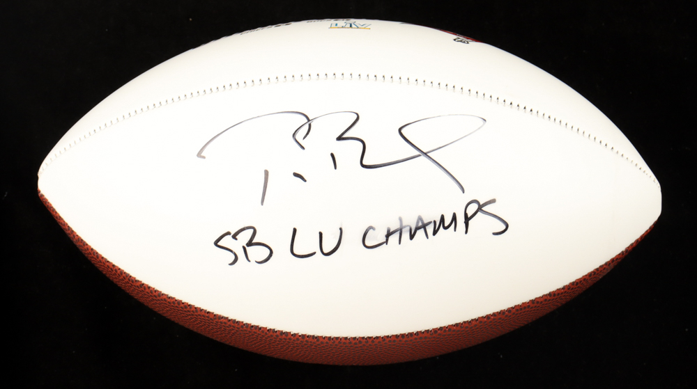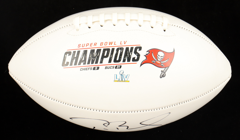 Super Bowl LV Champions Logo Football. Hand-signed and inscribed by Tom Brady (Tampa Bay Buccaneers). Please note, the inscription has been smudged.