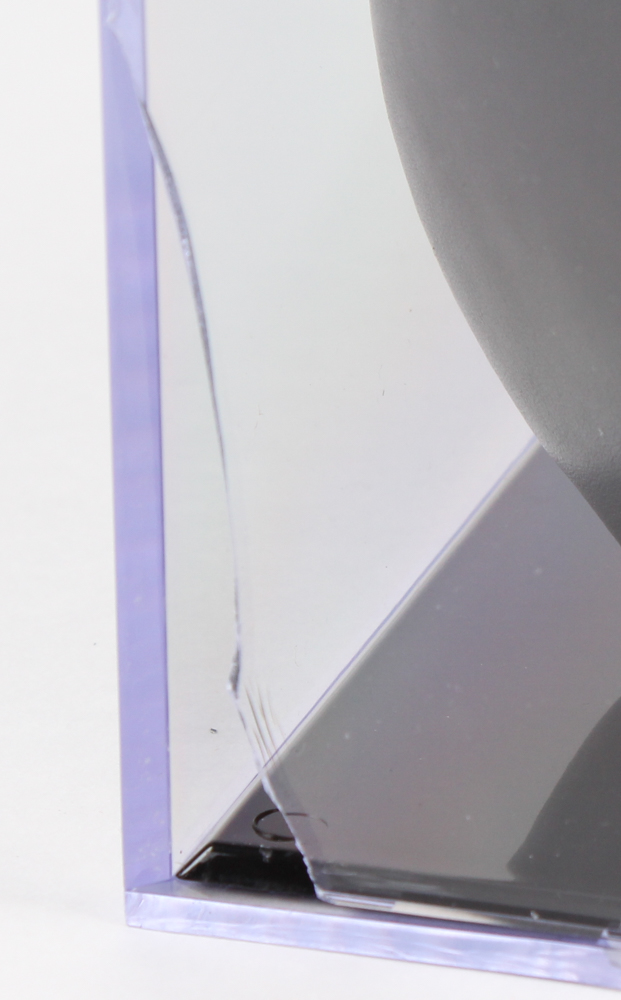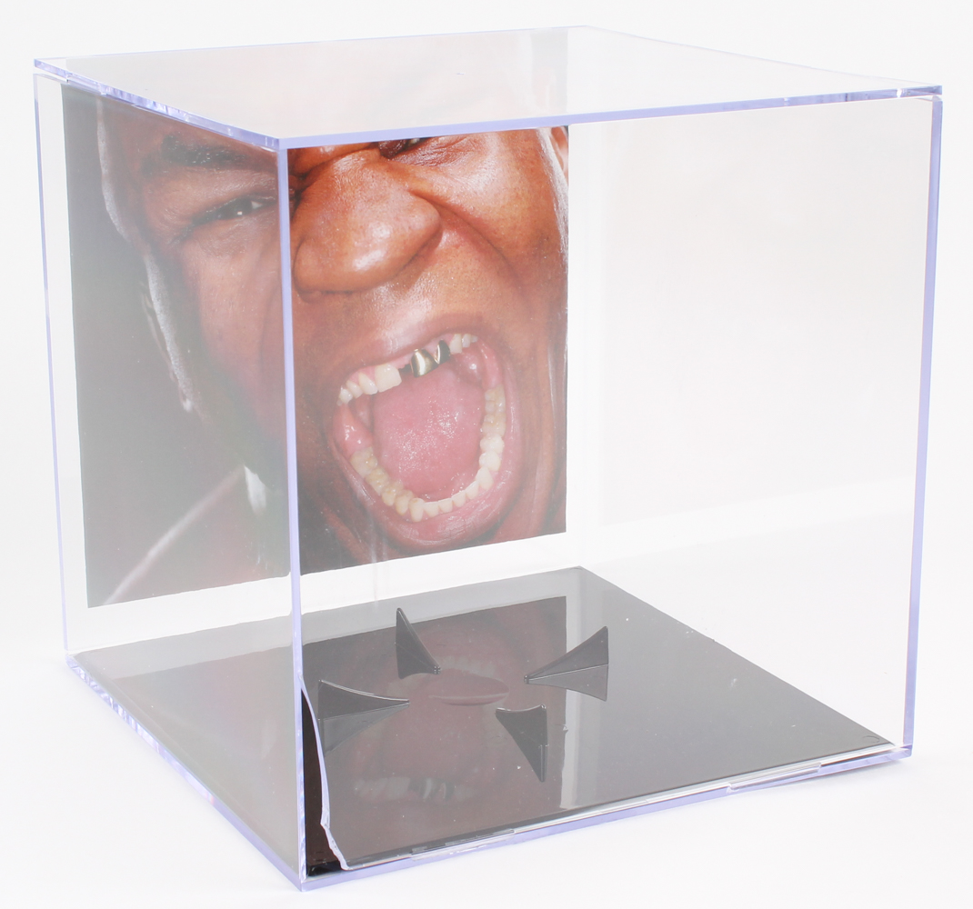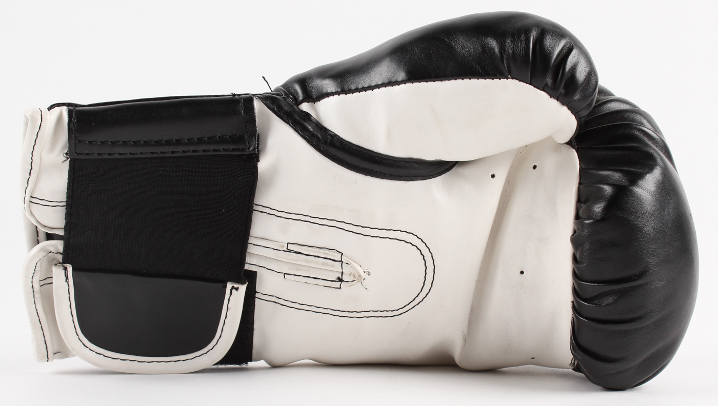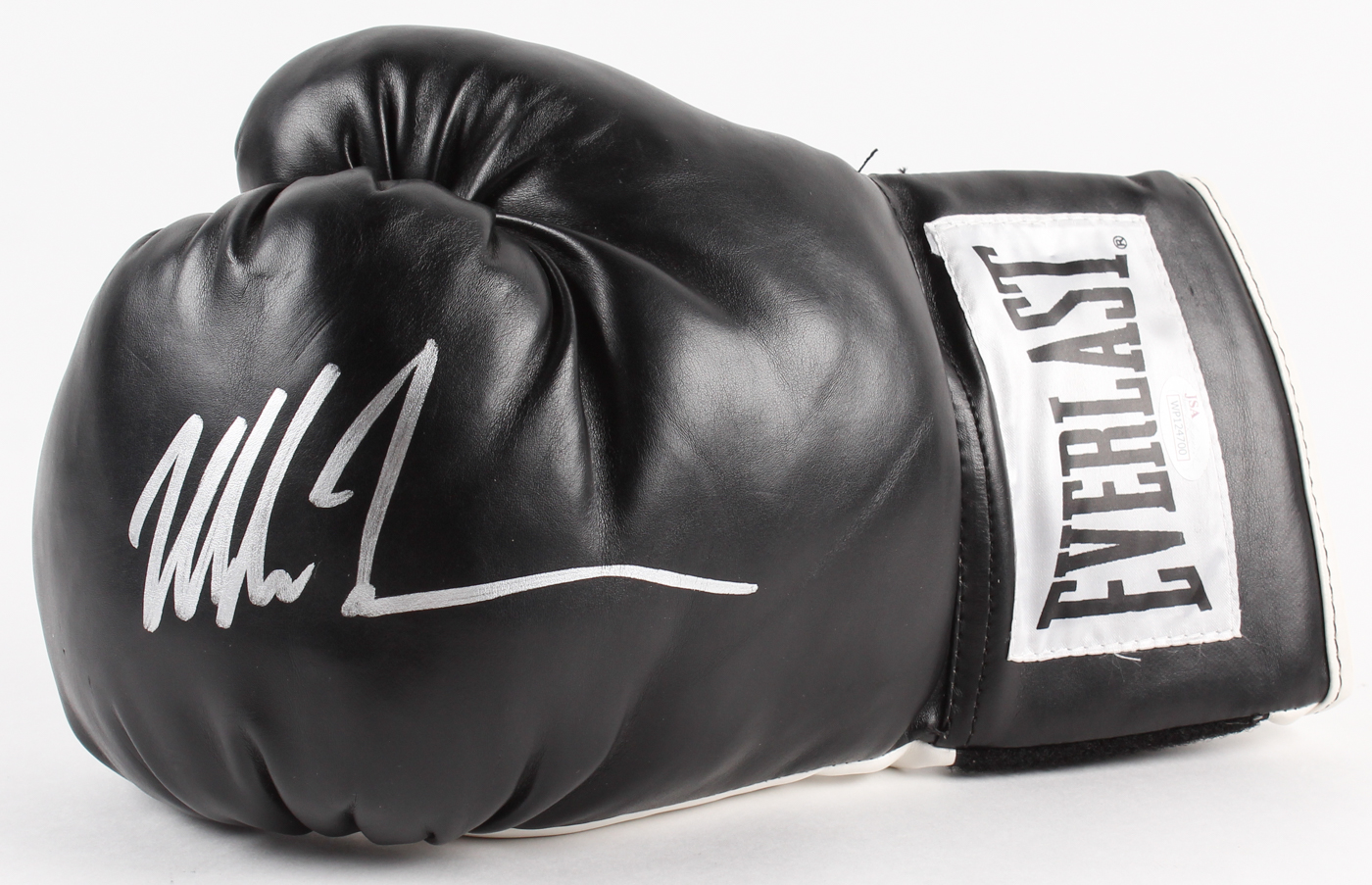 Everlast boxing glove is hand-signed in silver paint pen by Mike Tyson (HOF). The glove includes the display case as shown. Please note: There is a crack in the bottom left corner of the display case.