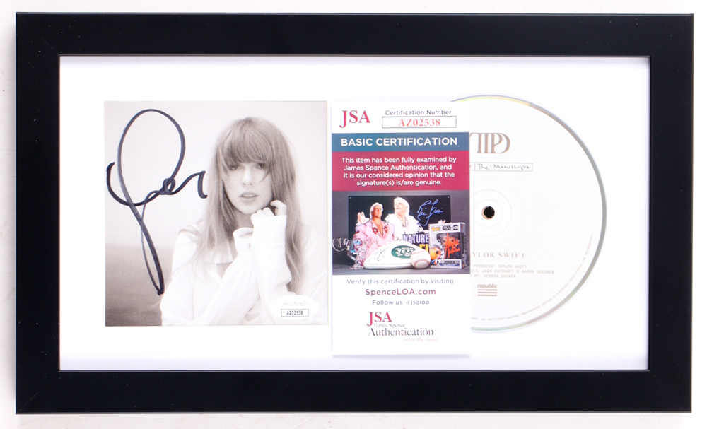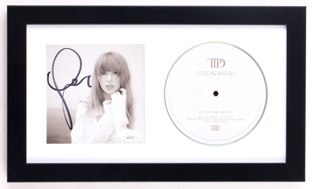 Custom frame measures approximately 8" x 13.25" in size. Features a "The Torture Poets Department" CD insert that has been hand-signed by Taylor Swift. The display also includes the disc as shown. Please note, there is slight scuffing on the frame.