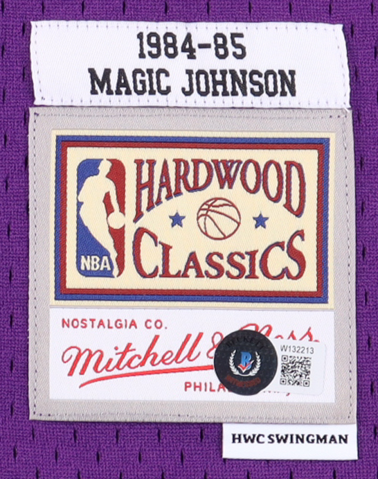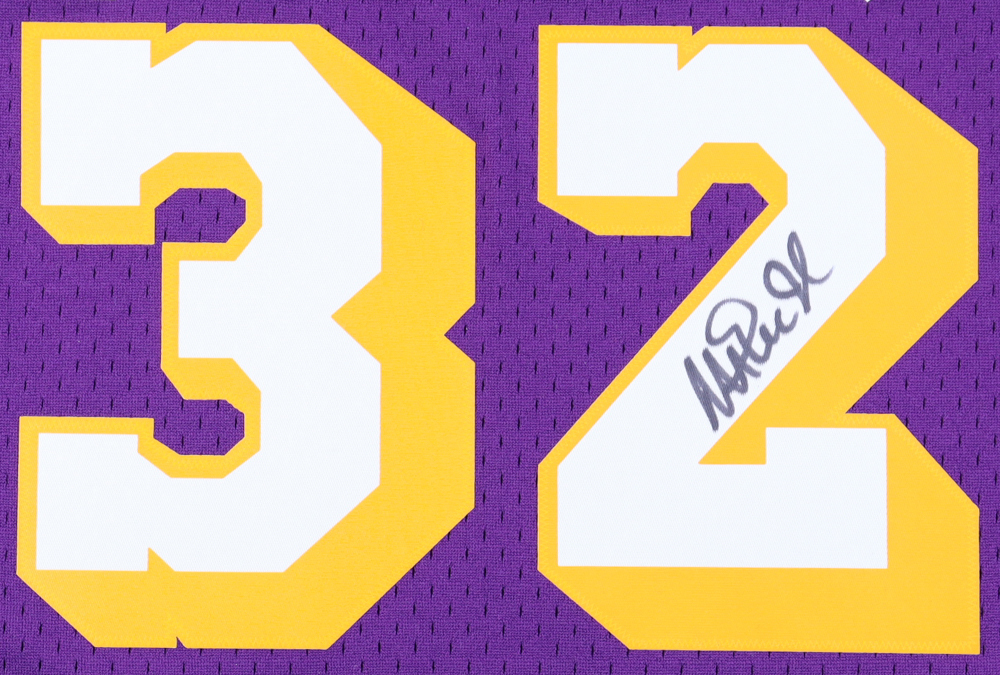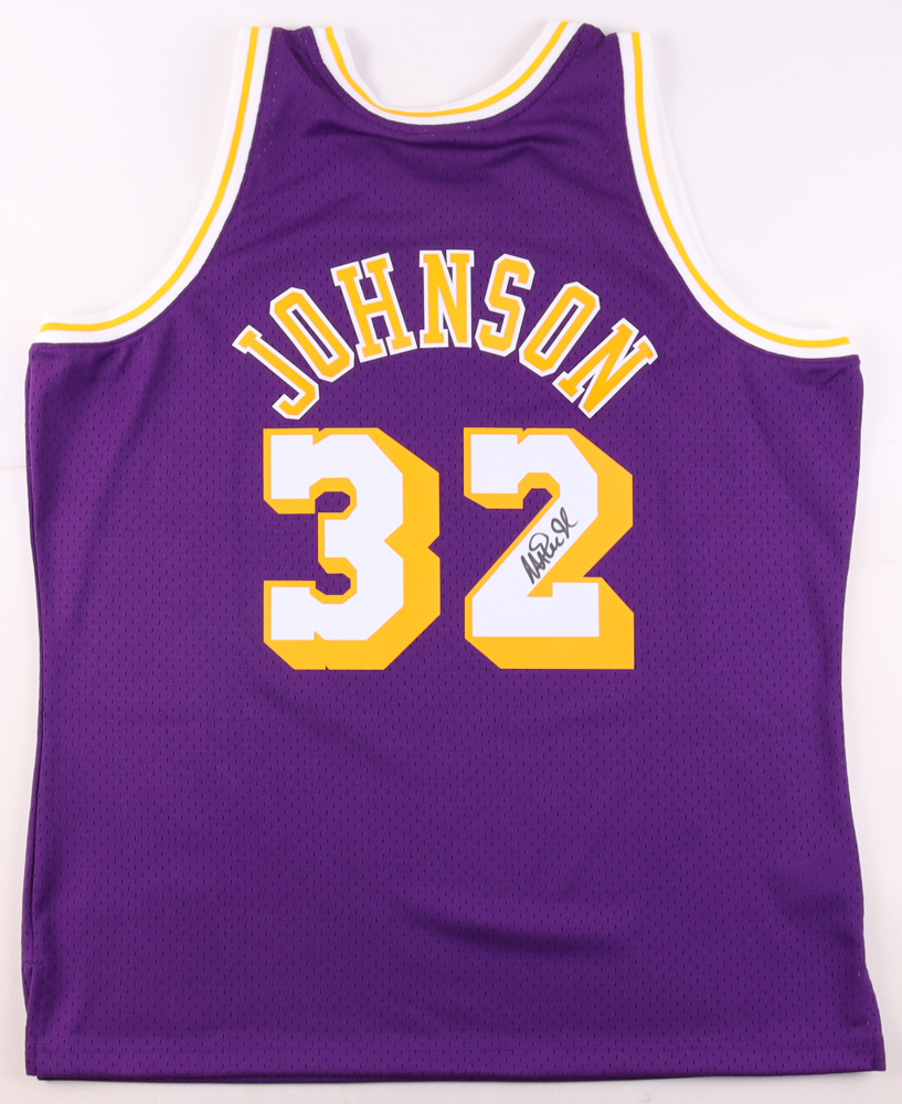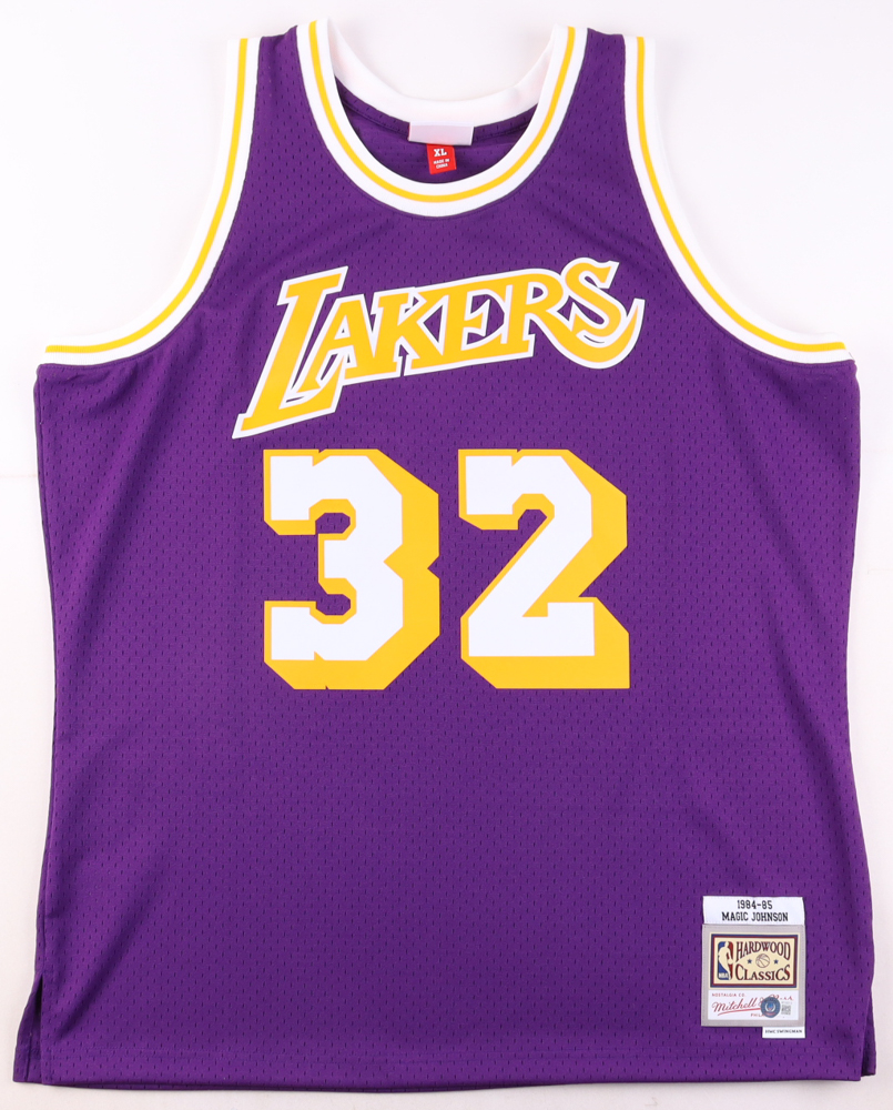 Mitchell & Ness jersey with everything printed on, size XL. Hand-signed by Magic Johnson (Los Angeles Lakers, HOF).