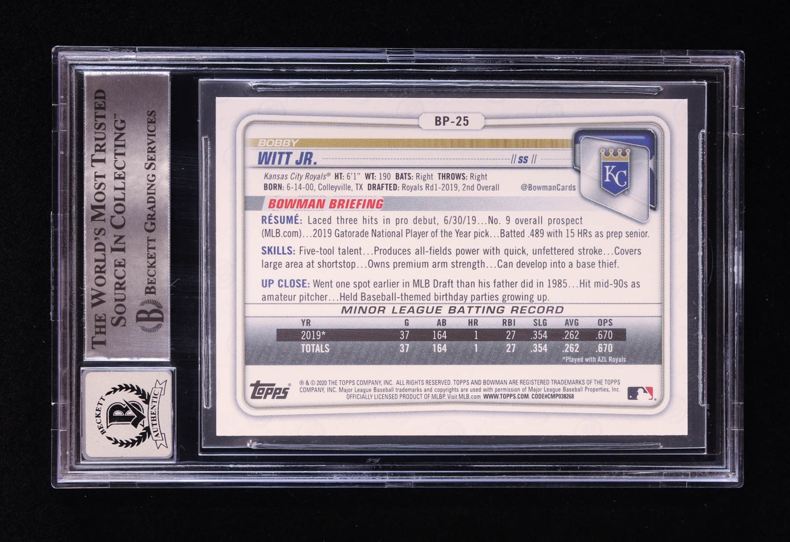 Bobby Witt Jr. Signed 2020 Bowman Prospects #BP25 RC (BGS | Auto 10)