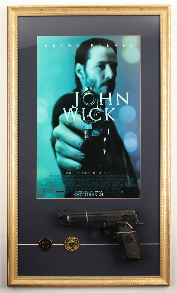 "John Wick" Custom Framed Movie Poster Display with Replica Baretta Pistol, Adjudicator Coin & Gold Coin