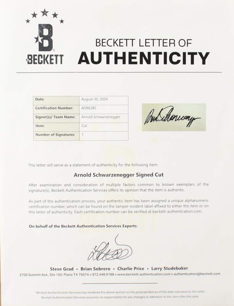 Display measures approximately 15.5" x 22.5" in size. Features a cut that has been hand-signed by Arnold Schwarzenegger.