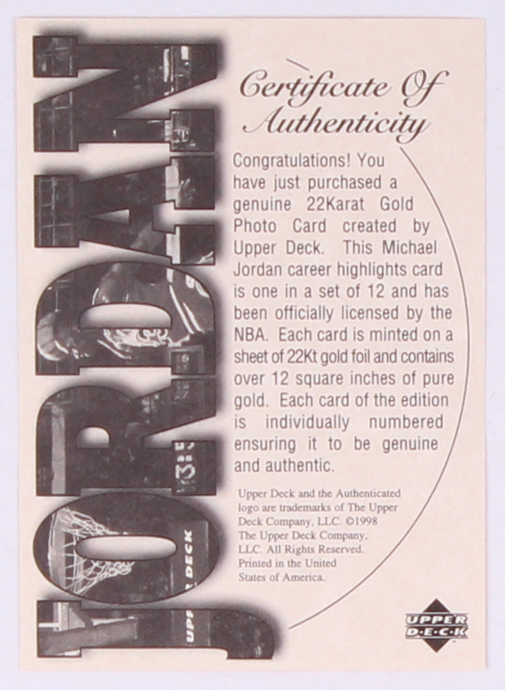 Michael Jordan Upper Deck #3 22K Gold Basketball Card (Upper Deck COA)