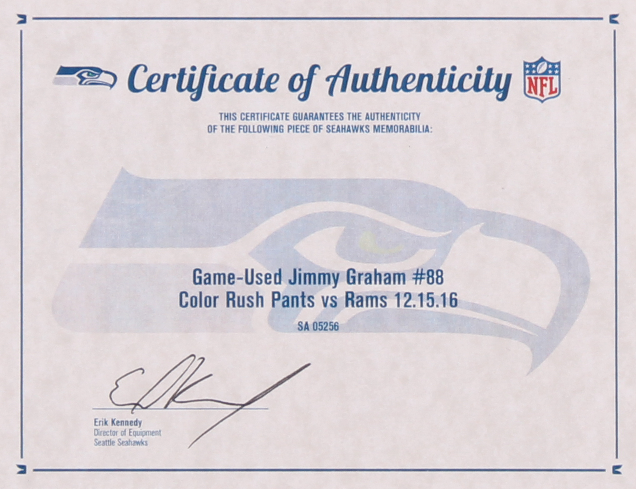 The pants include an official Seattle Seahawks Team hologram and matching COA for authenticity purposes.
