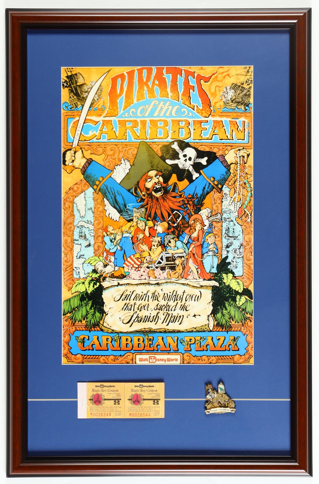 Disney World "Pirates of the Caribbean" Custom Framed Poster Print with Vintage Ticket Book & Official Ride Pin