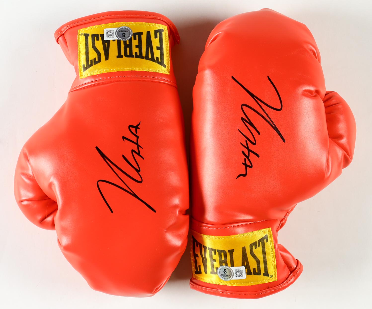 Pair of (2) Everlast boxing gloves. Both gloves have been hand-signed by Julio Cesar Chavez. Includes display case and wrap.