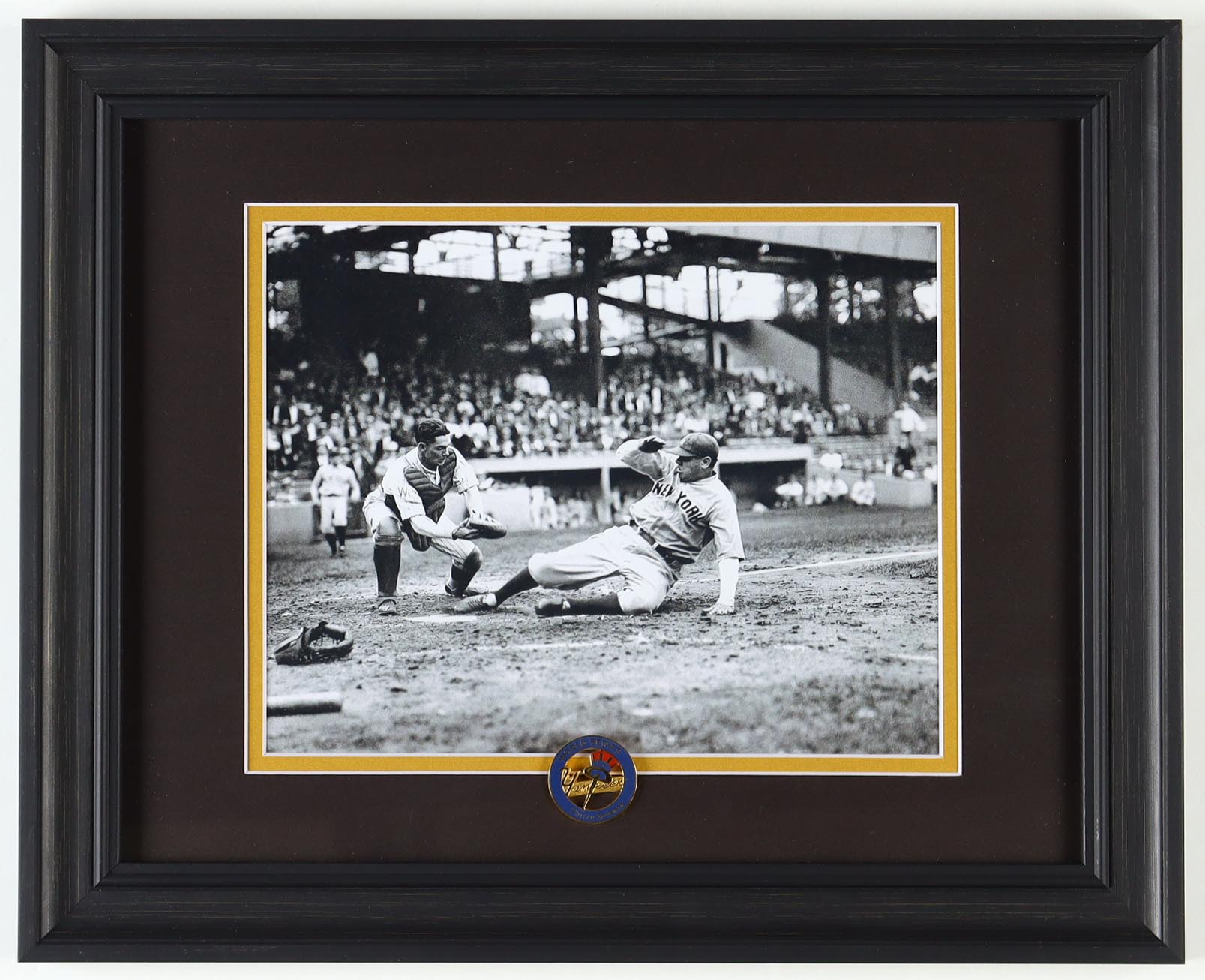 "Babe Ruth Sliding into Home Plate" Custom Framed Photo with Yankees 37th World Series Commemorative Pin