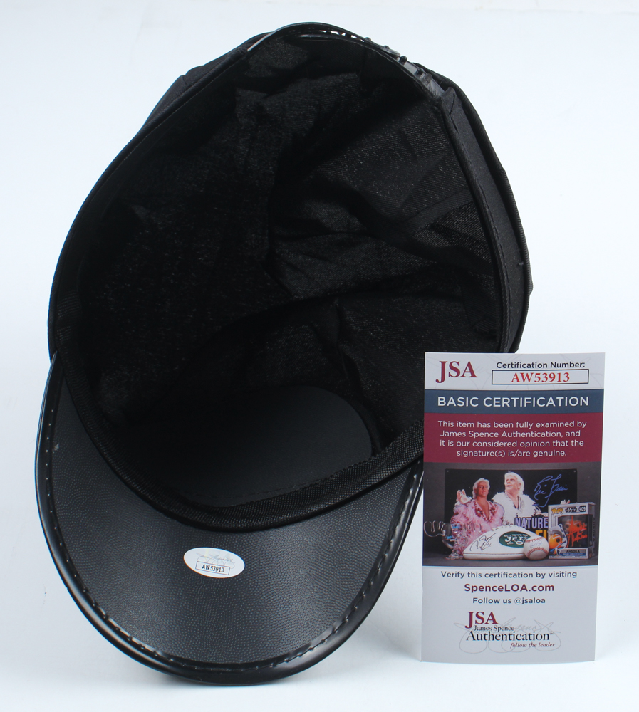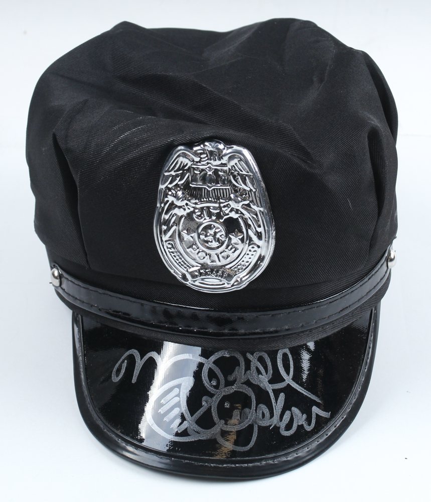 Replica Police Office Hat. Hand-signed and hand-drawn by Michael Winslow. Please note, there is staining near the badge and the signature is smudged.