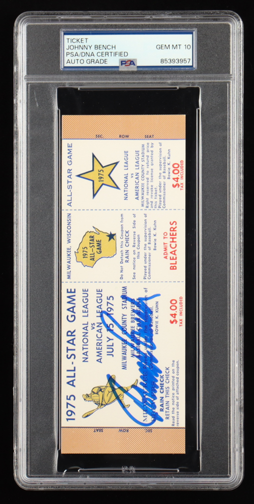 Johnny Bench Signed 1975 All-Star Game Ticket (PSA GEM MT 10)