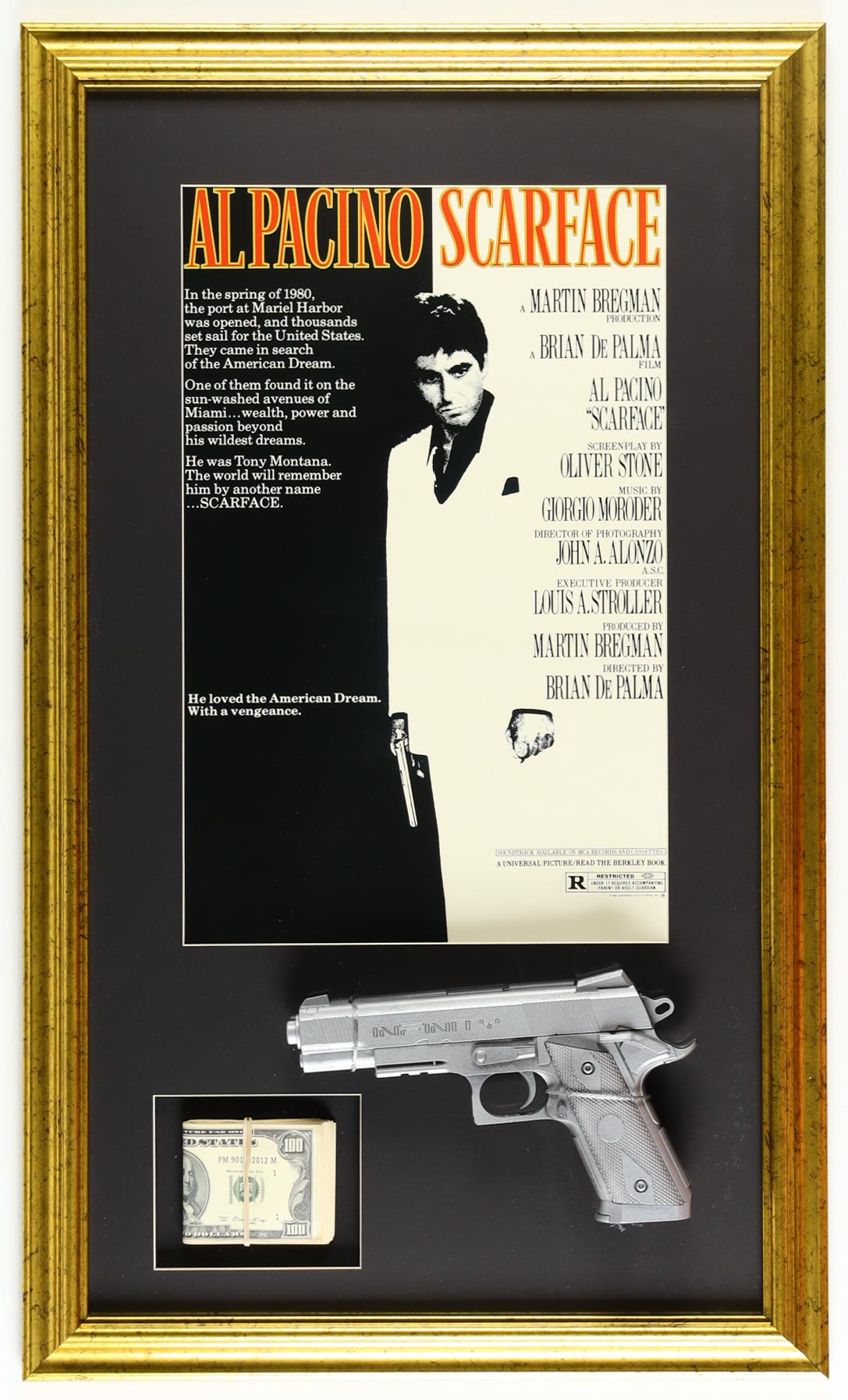 Custom frame measures approximately 18" x 29.5" in size and features an unsigned movie poster print from the film "Scarface". Display also features a prop replica money stack and a prop pistol. Please note, the display is unsigned.