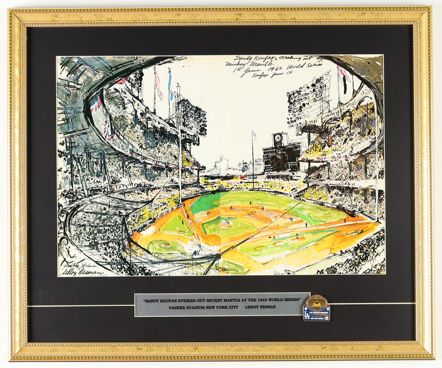 LeRoy Neiman "Sandy Koufax Strikes Out Mickey Mantle at the 1963 World Series" Custom Framed Art Print with Yankees 1963 World Series Sweep Pin