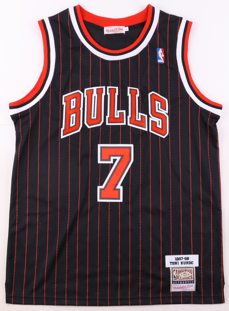 Mitchell & Ness jersey with everything sewn on, size L. Hand-signed by Toni Kukoc (Chicago Bulls, HOF).
