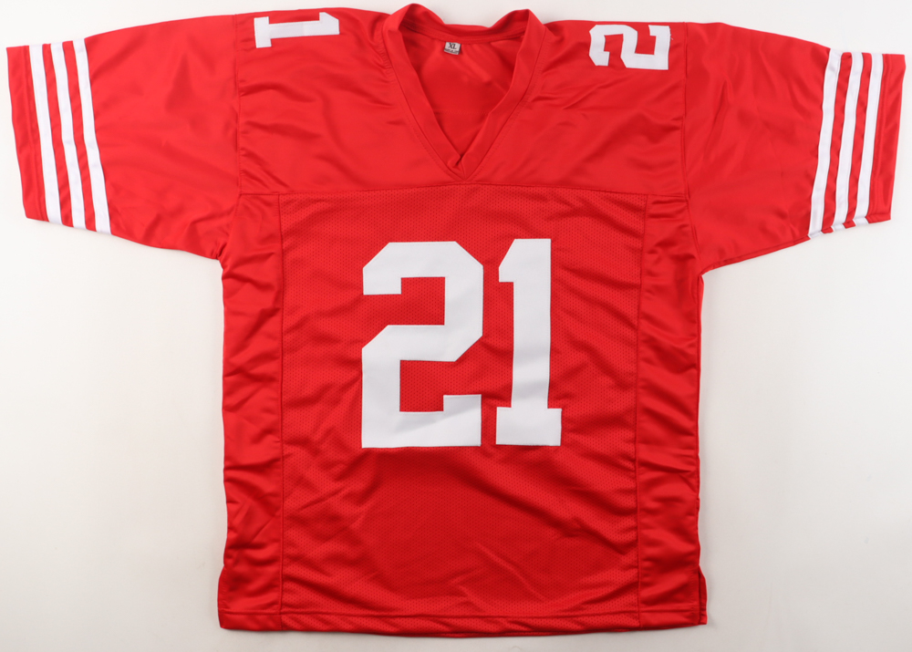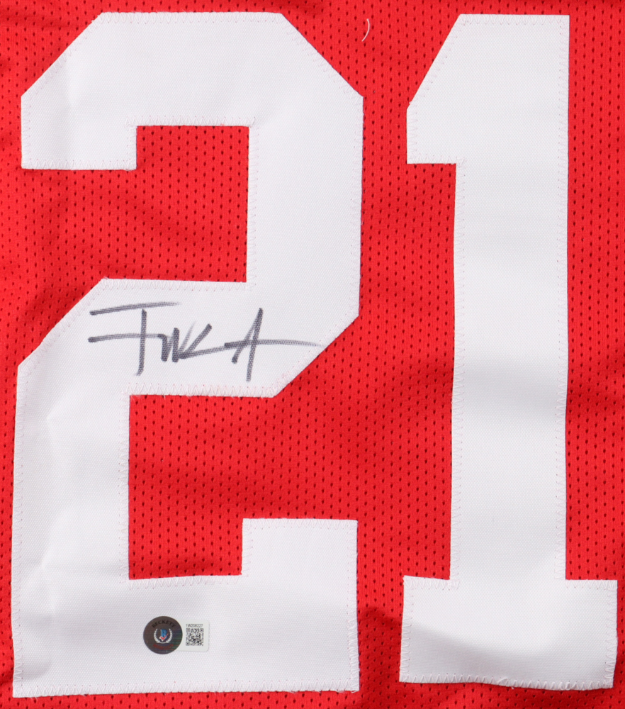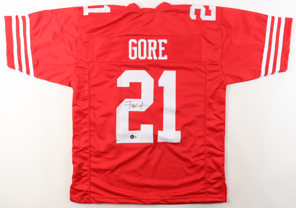 Custom jersey with everything sewn on, size XL. Hand-signed by Frank Gore.