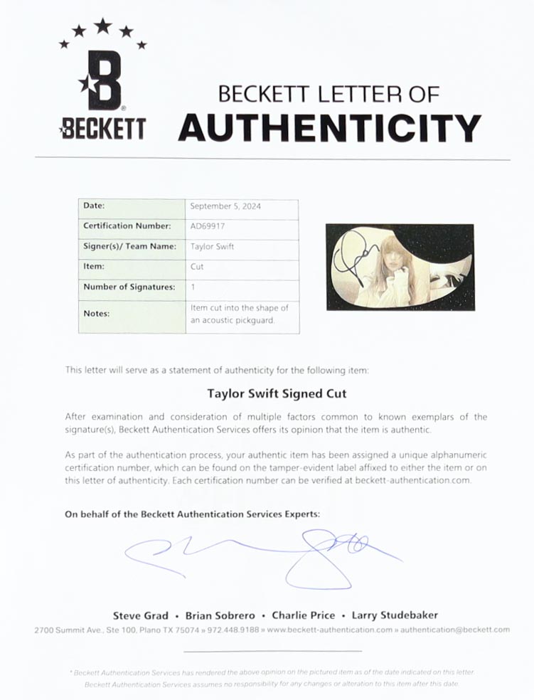 Acoustic guitar measures approximately 41" long and has been hand-signed on a cut that has been repurposed as the pick-guard by Taylor Swift.