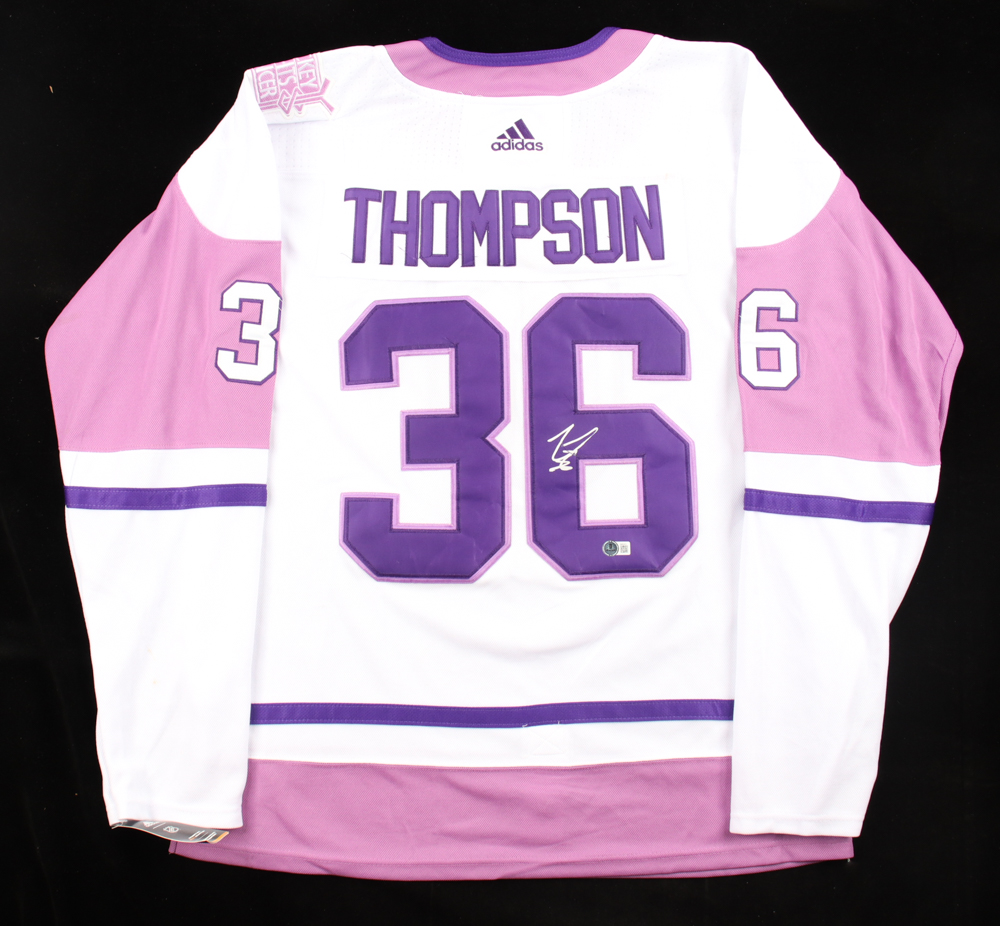 Adidas jersey. Everything is sewn on, size 54. Hand-signed by Logan Thompson. Please note, there is staining on the name plate and left sleeve. See photos regarding the condition of the item.