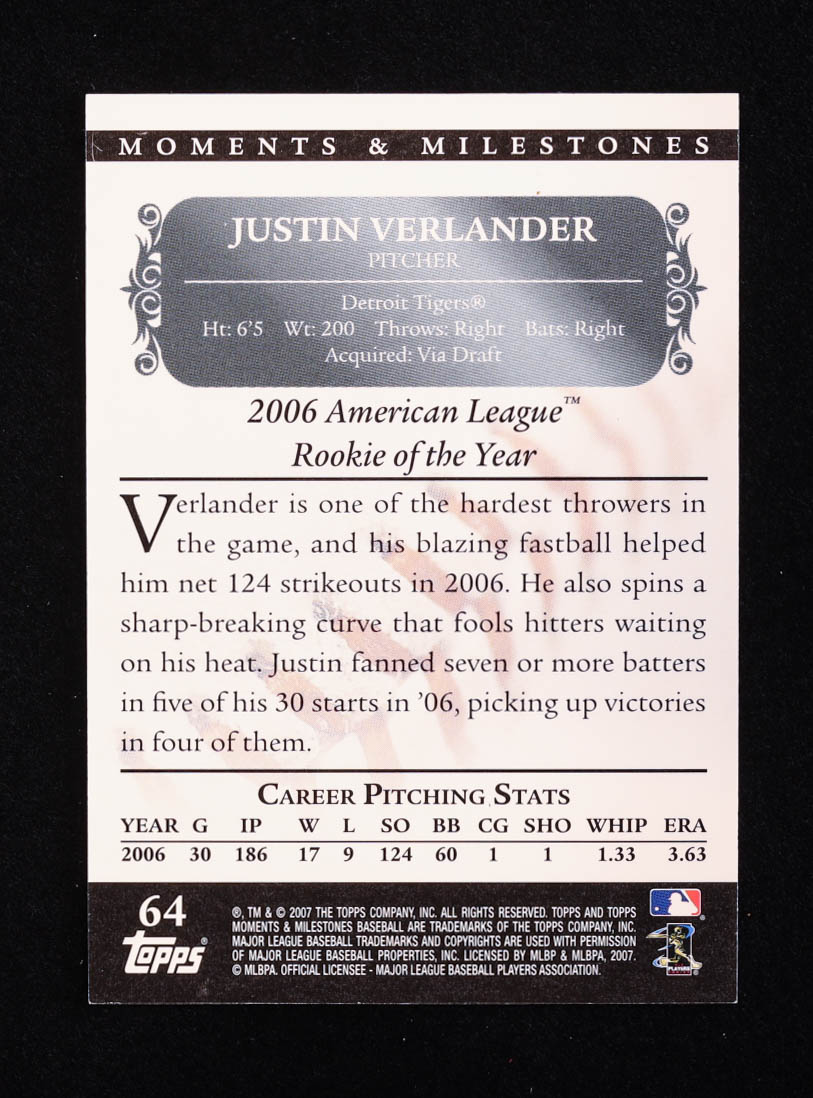 Justin Verlander 2007 Topps Moments and Milestones Black #64-103 / SO 103 #02/29