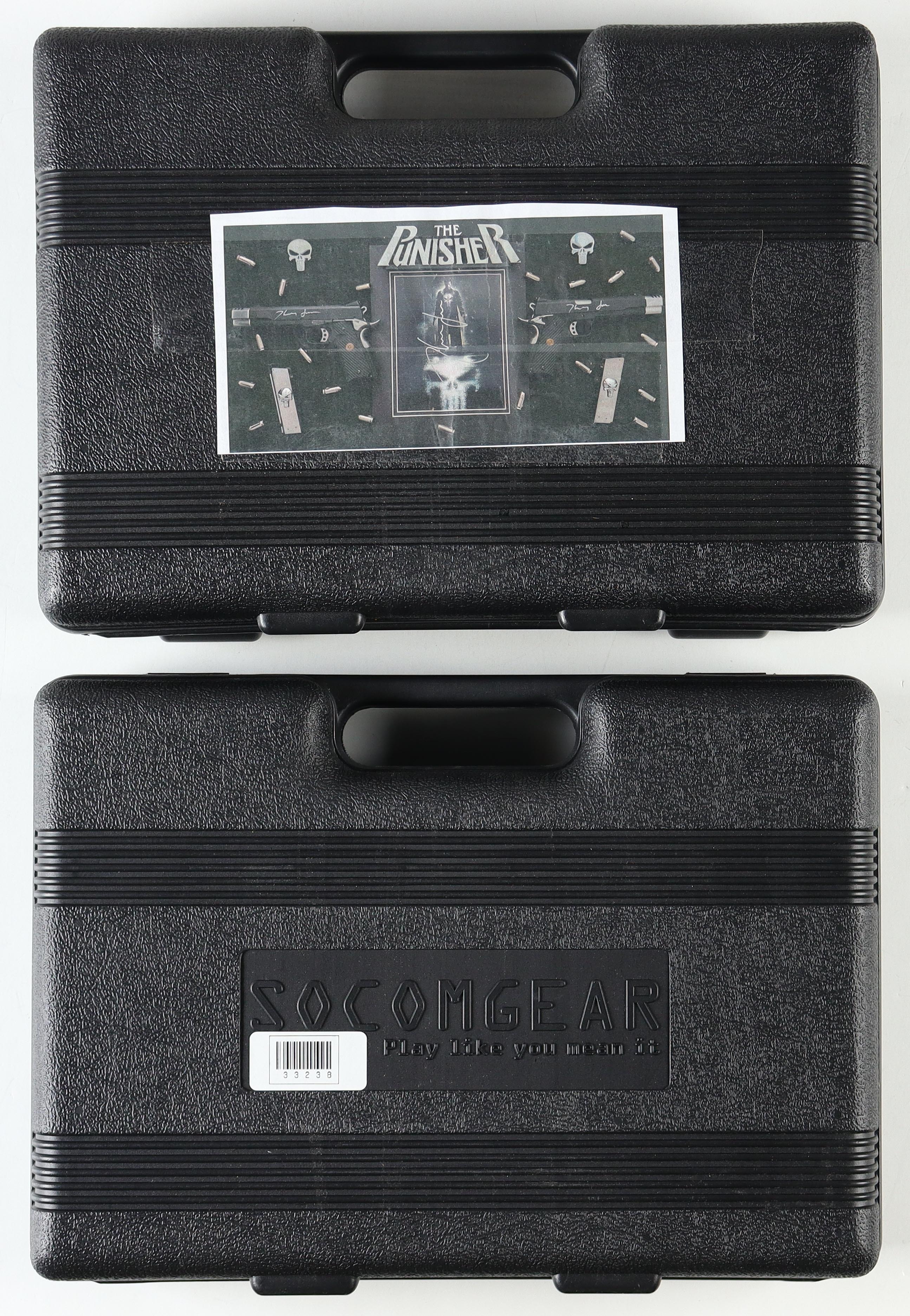 Set of (2) Socom Gear Special Edition Punisher 1911 Airsoft Gas Blowback pistols have been hand-signed by The Punisher himself, Thomas Jane! Jane signed each of these airsoft pistols individually and each one comes with (10) blank dummy rounds for display. The pistols also included a "The Punisher" plastic logo and blank magazines.