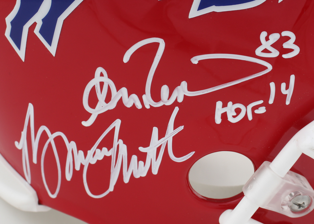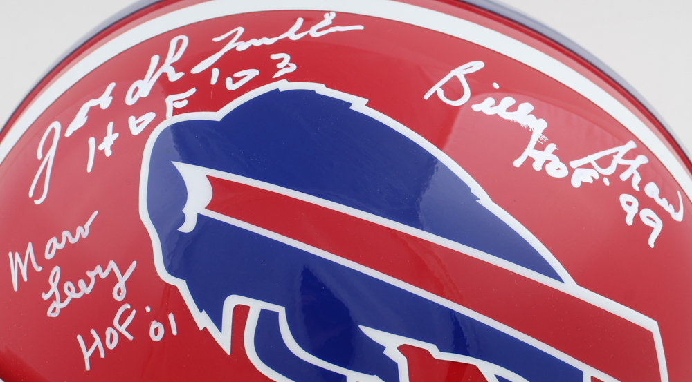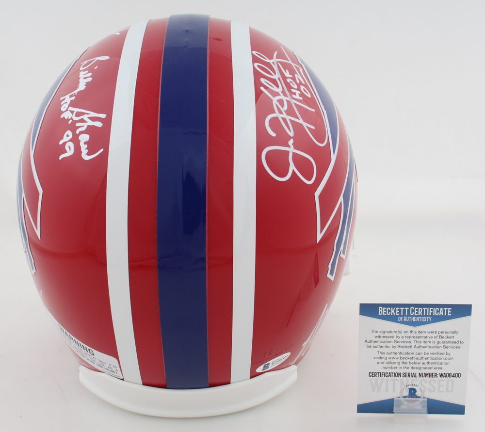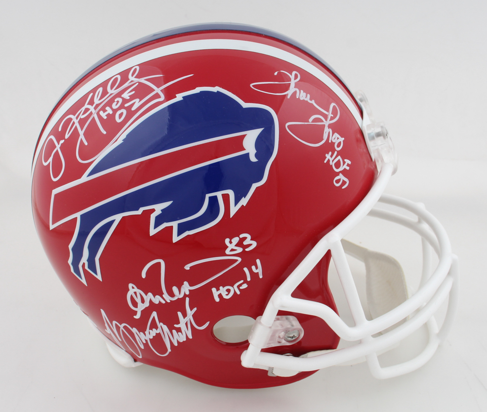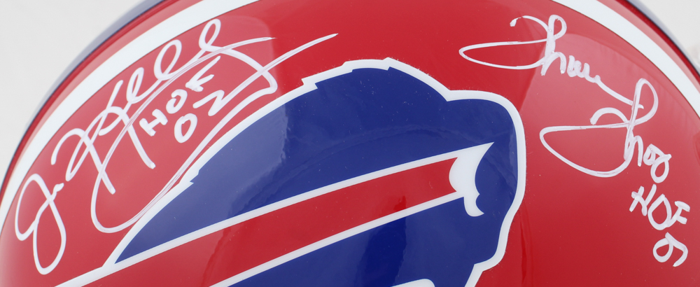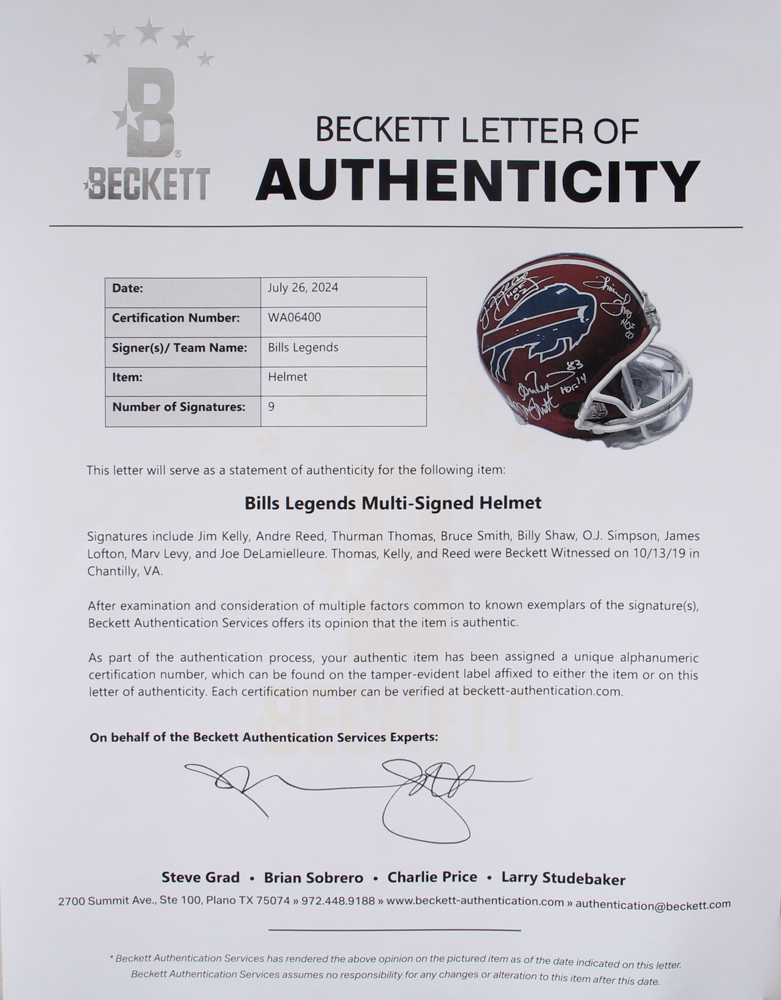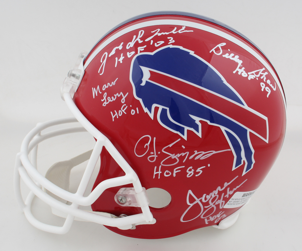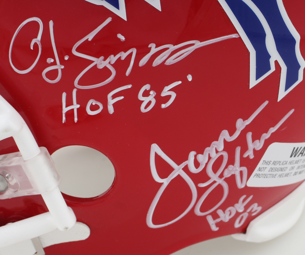Buffalo Bills full-size replica helmet. Hand-signed and inscribed by Jim Kelly (HOF), Andre Reed (HOF), Thurman Thomas (HOF), Bruce Smith (HOF), Billy Shaw (HOF), O.J. Simpson (D.2024, HOF), James Lofton (HOF), Marv Levy (HOF), and Joe DeLamielleure (HOF). Please note, Thurman Thomas, Jim Kelly, & Andre Reed were Beckett Witnessed on 10/13/2019.