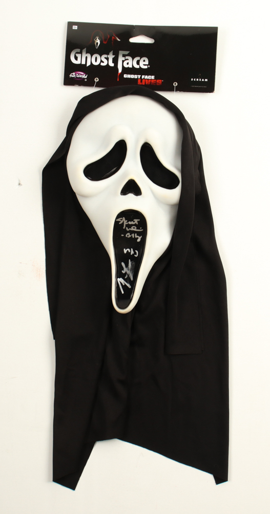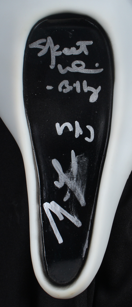 "Scream" Ghostface mask has been hand-signed and inscribed by Matthew Lillard (Stu Macher) and Skeet Ulrich (Billy). Please note, the signatures are smudged.