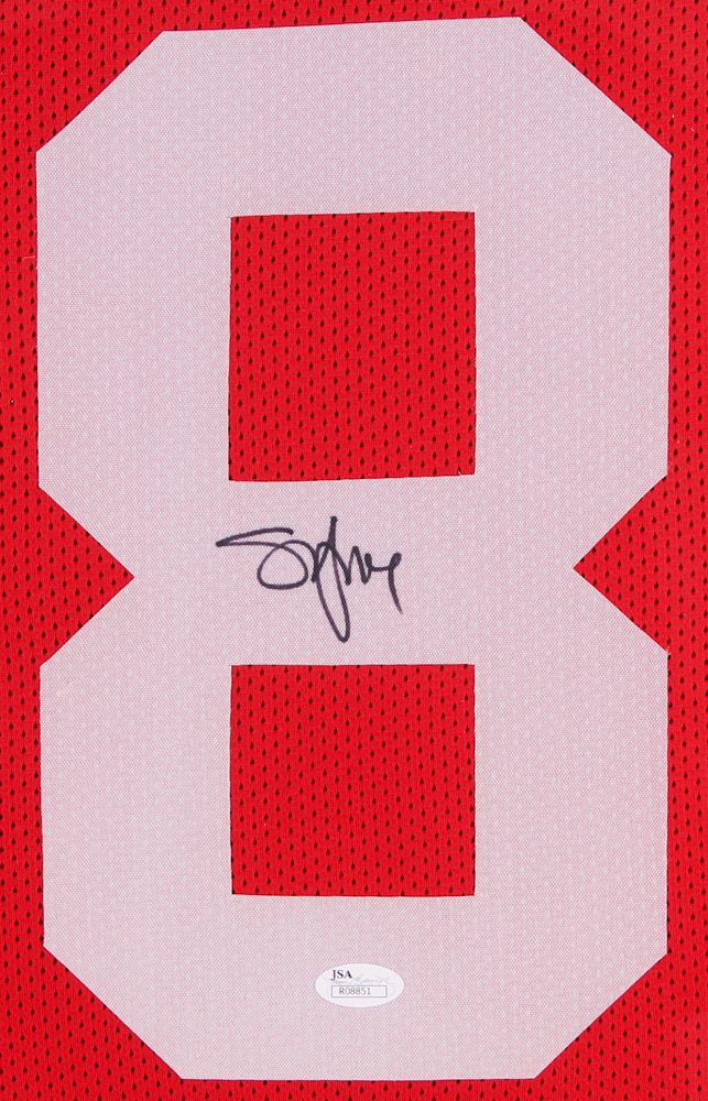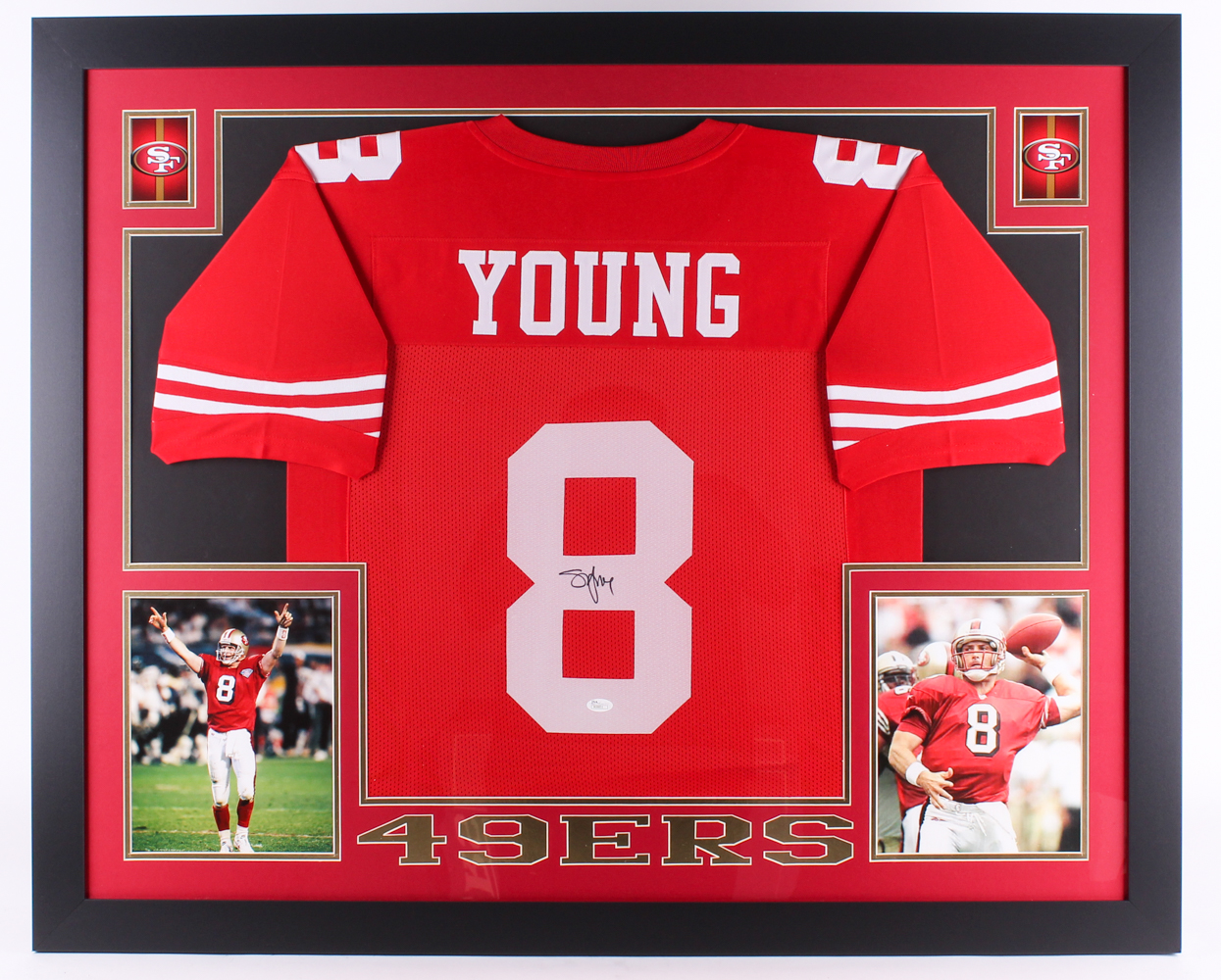 Custom frame measures approximately 35" x 43" in size and features a jersey which has been hand-signed in black felt-tip pen by Steve Young.