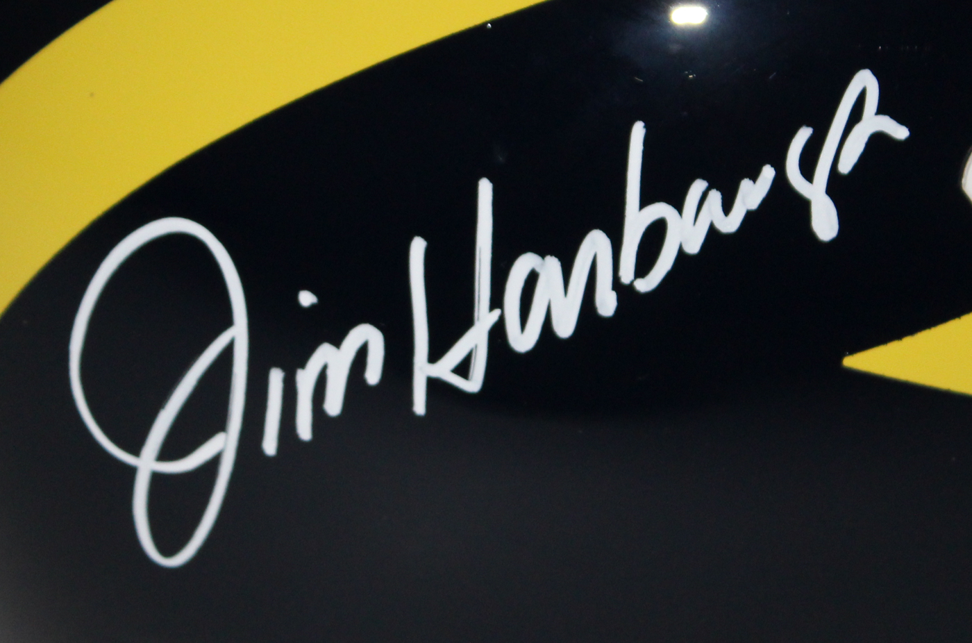 Schutt full-size replica helmet has been hand-signed in white paint pen by Jim Harbaugh (Coach).