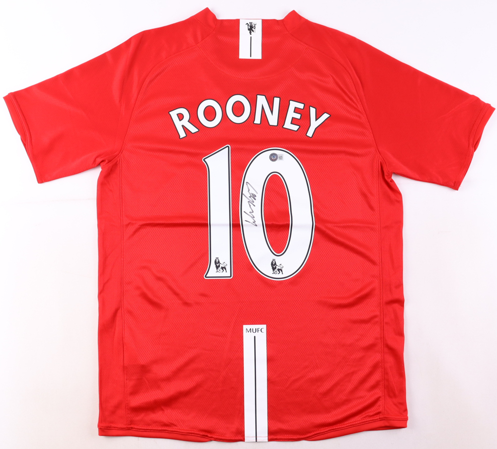 Nike style jersey with everything pressed on, size L. Hand-signed by Wayne Rooney.