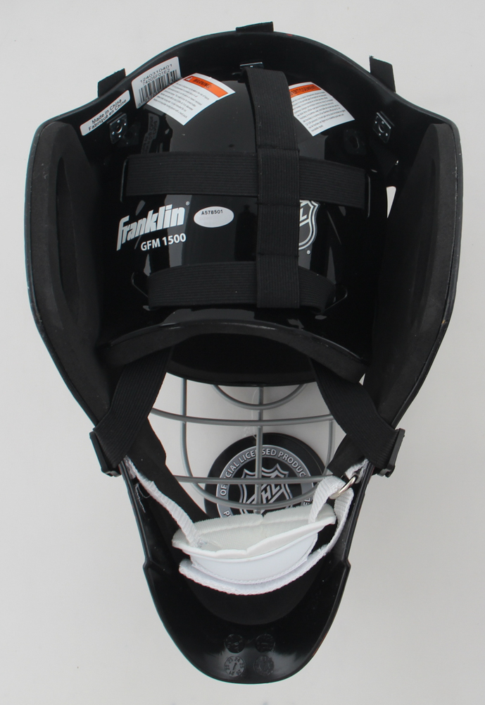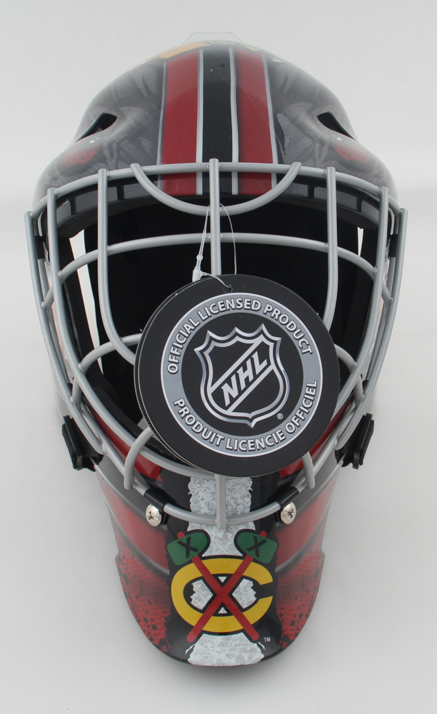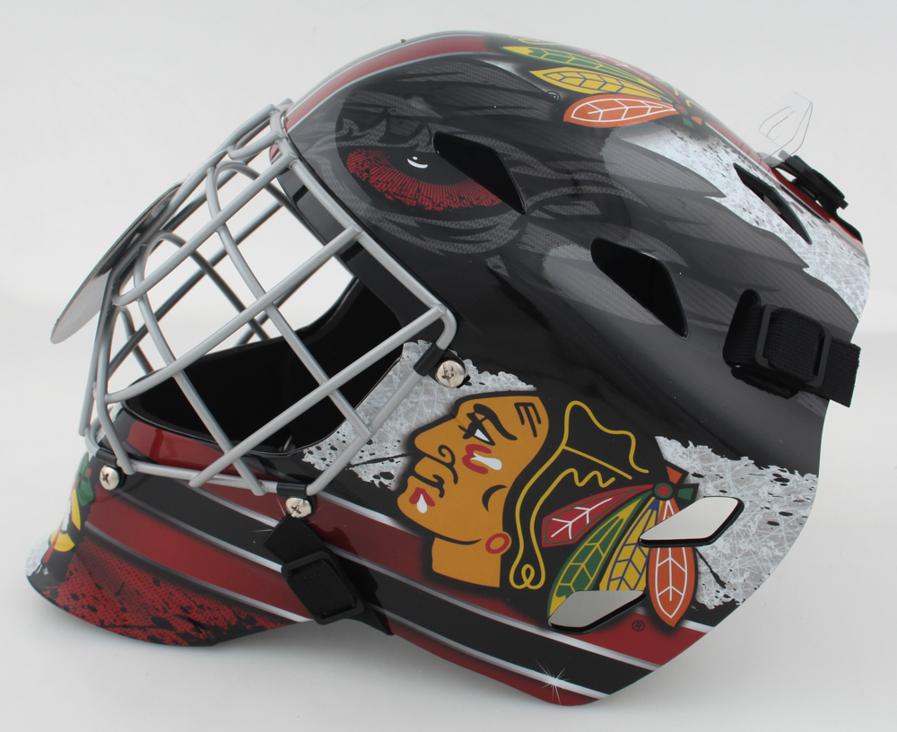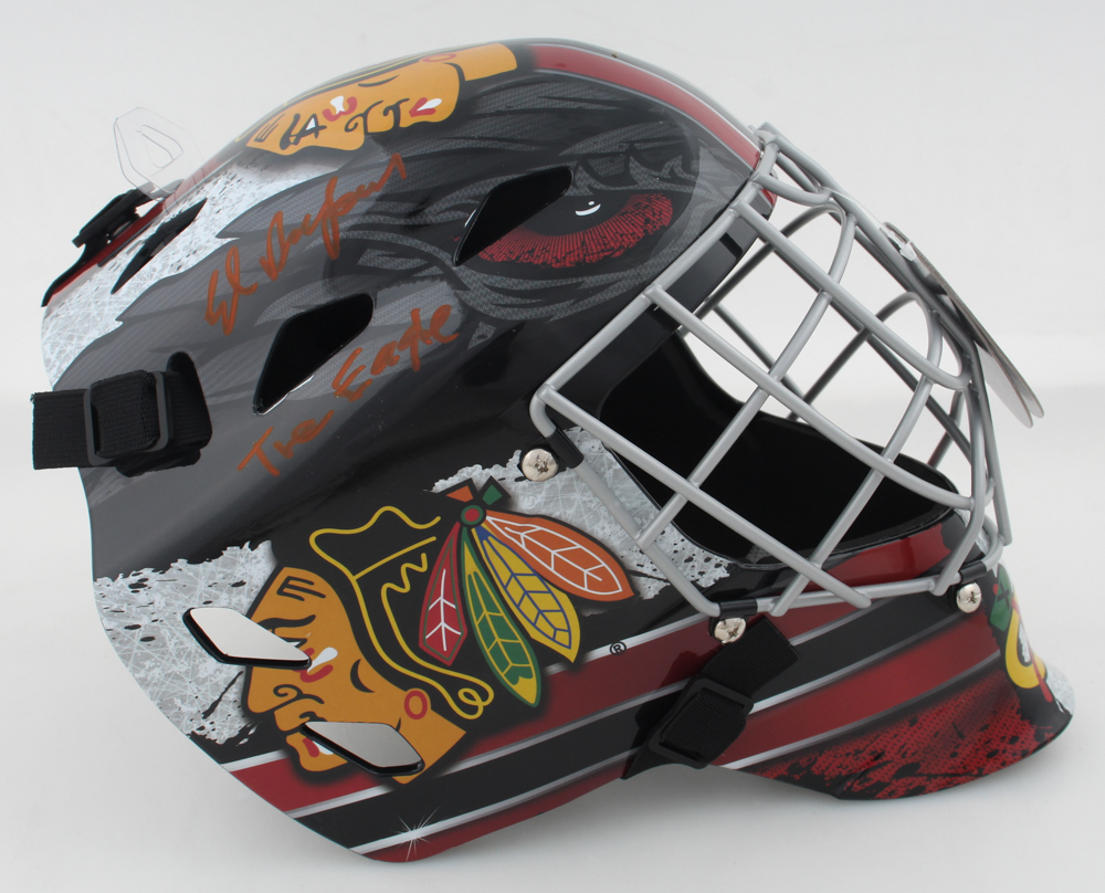 Franklin Chicago Blackhawks full-size replica goalie mask. Hand-signed and inscribed by Ed Belfour (HOF).