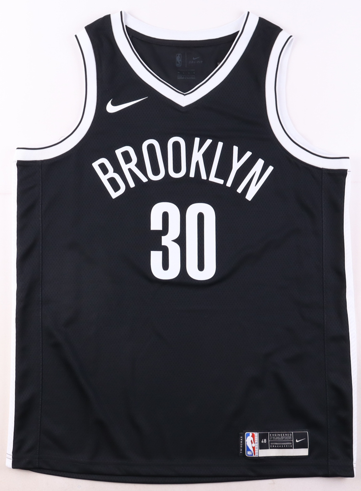 Nike jersey. Everything is pressed on, size 48. Hand-signed and inscribed by Seth Curry (Brooklyn Nets).