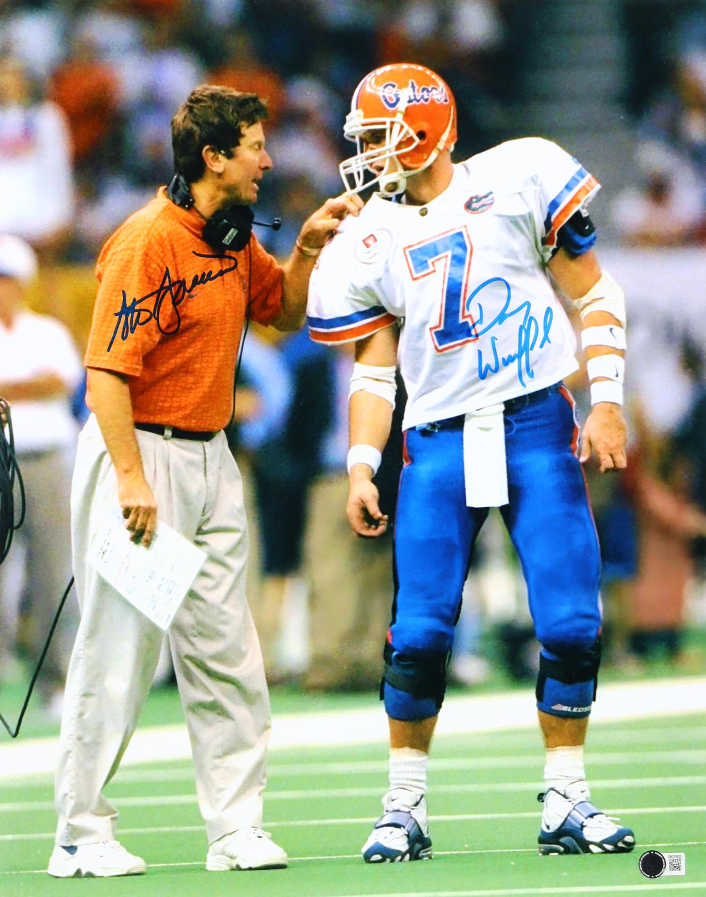Photo measures 16" x 20" in size. Hand-signed by Steve Spurrier (Coach) and Danny Wuerffel (Florida Gators).
