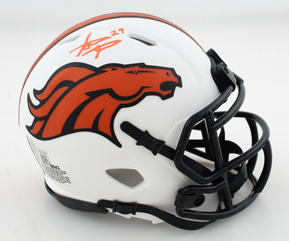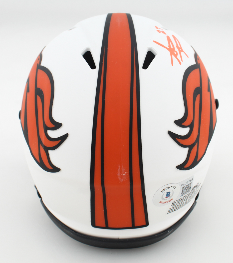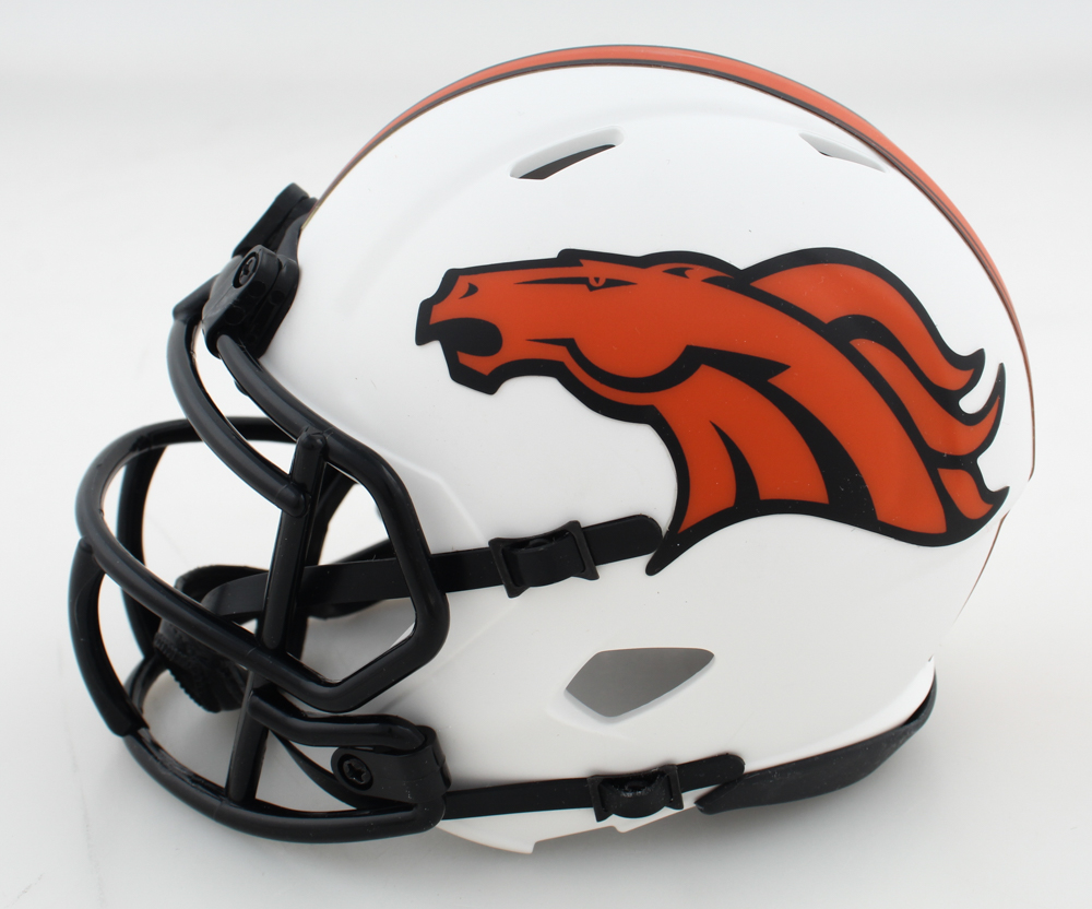 Riddell Denver Broncos Lunar Eclipse Alternate speed mini helmet. Hand signed by Steve Atwater (HOF).