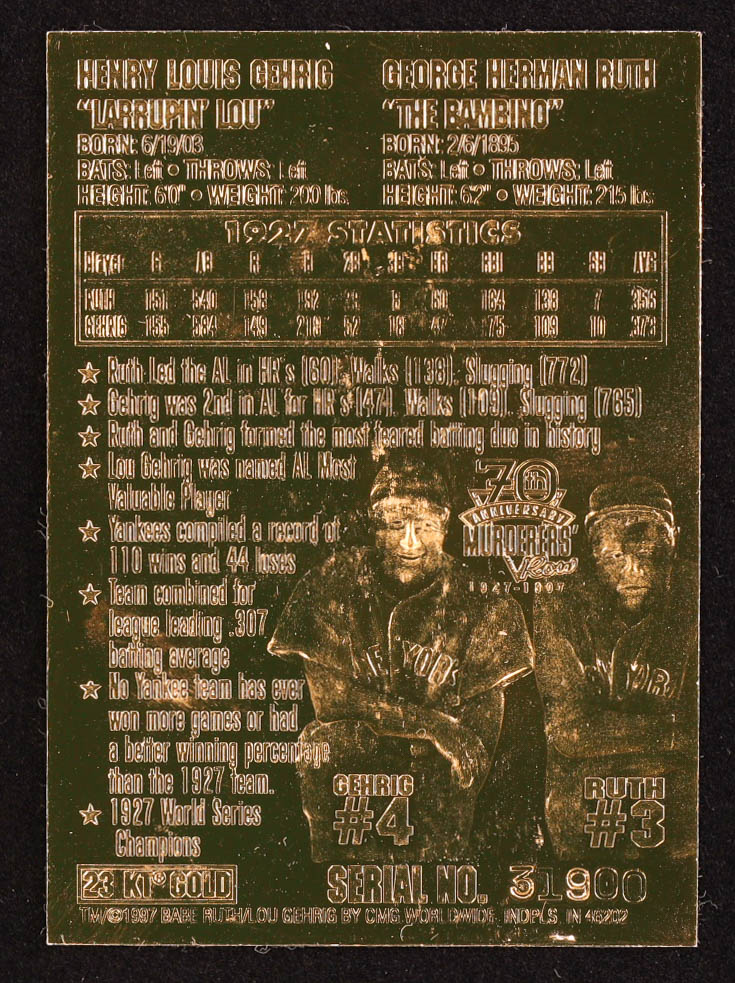 Babe Ruth / Lou Gehrig 1997 CMG Worldwide Murderers' Row 70th Anniversary 23Kt Gold Card