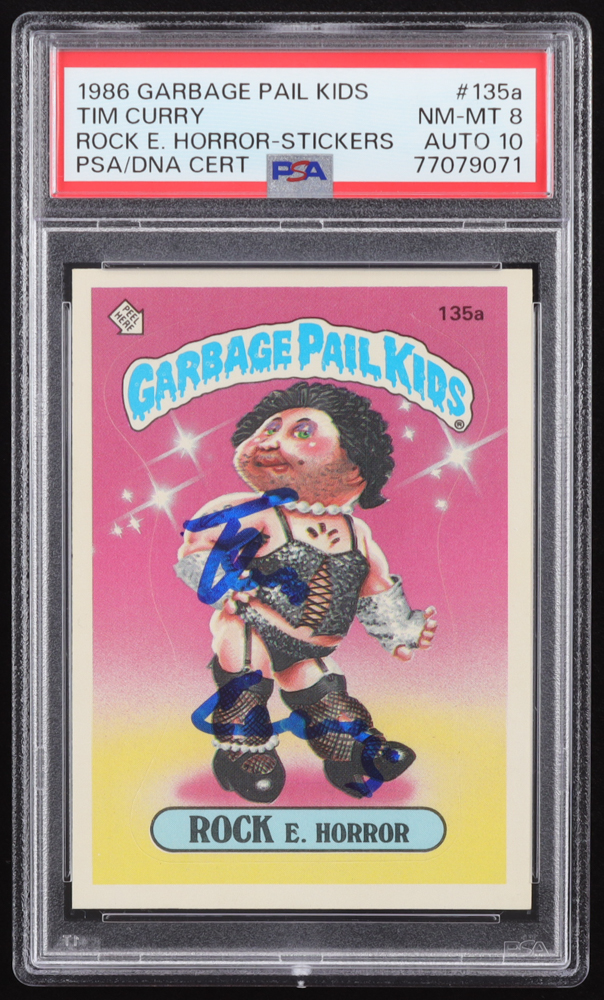 Tim Curry Signed 1986 Garbage Pail Kids "Rock E. Horror" Stickers #135a (PSA 8 | Autograph Grade PSA 10)