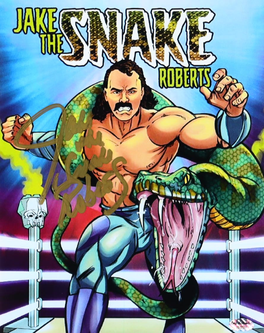 Photo measures 8" x 10" in size and has been hand-signed by Jake Roberts (HOF).