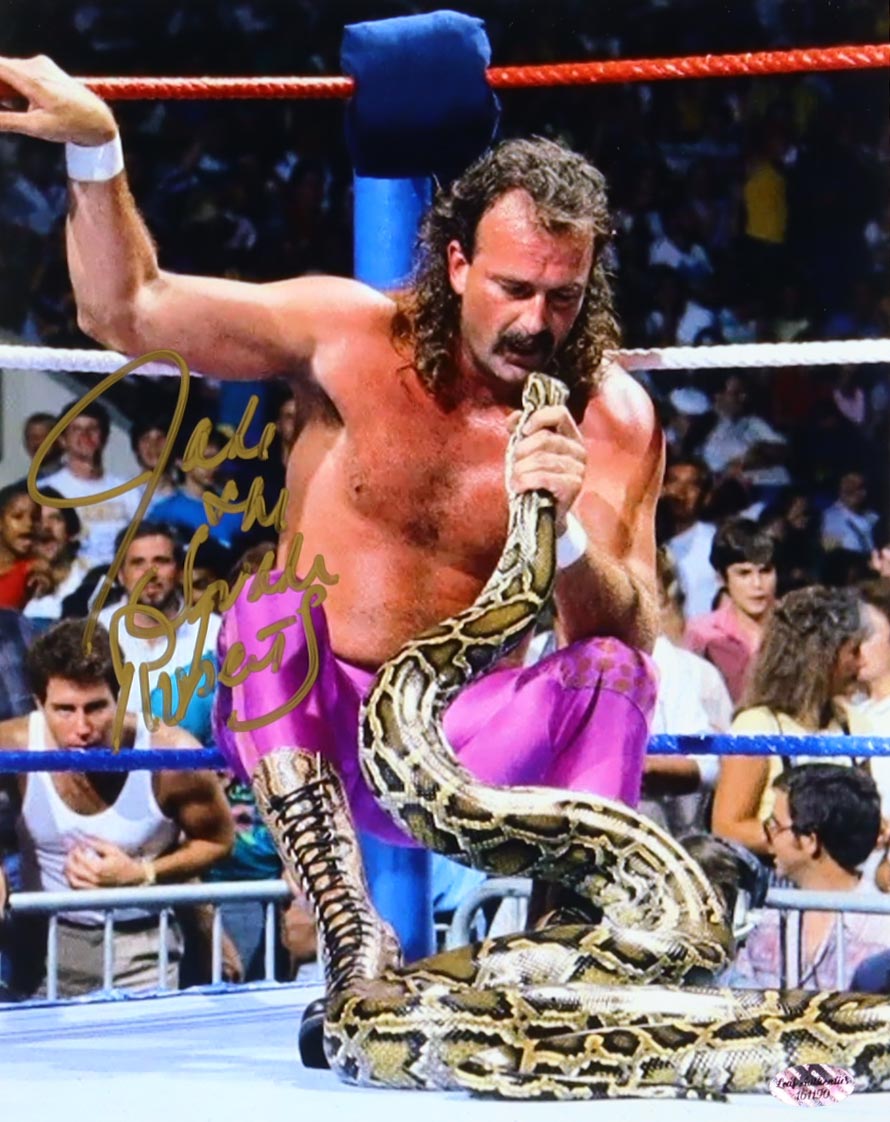 Photo measures 8" x 10" in size and has been hand-signed by Jake Roberts (HOF).