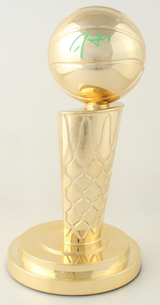 Replica 2024 Boston Celtics NBA Finals Championship trophy measures approximately 12" in height. Hand-signed by Jrue Holiday.