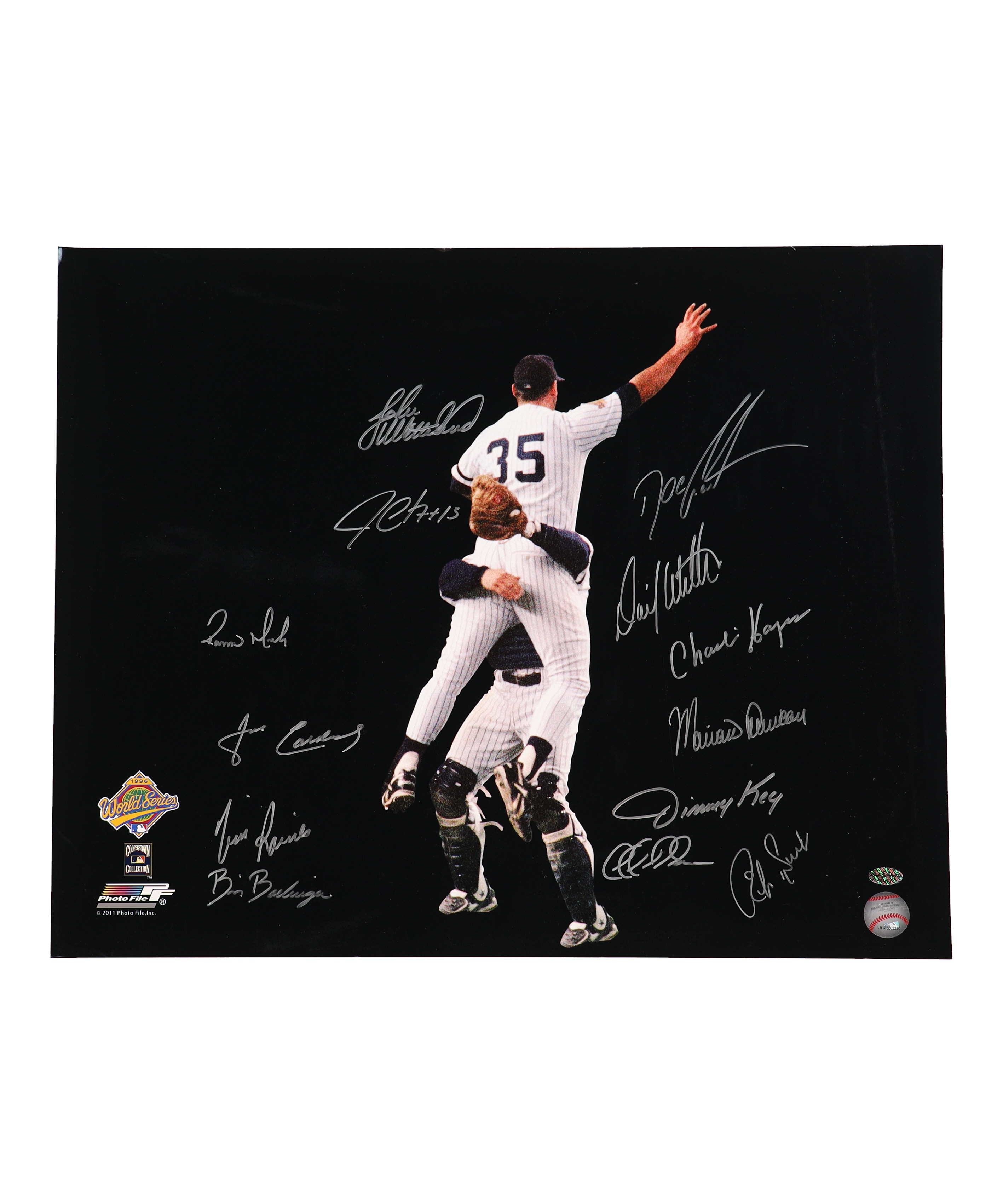 Poster measures 16" x 20" in size and has been hand-signed by (13) with Dwight Gooden, Jim Leyritz, Brian Boehringer, Tim Raines, Jimmy Key, John Wetteland, Charlie Hayes, Mariano Duncan, Graeme Lloyd and (4) others.