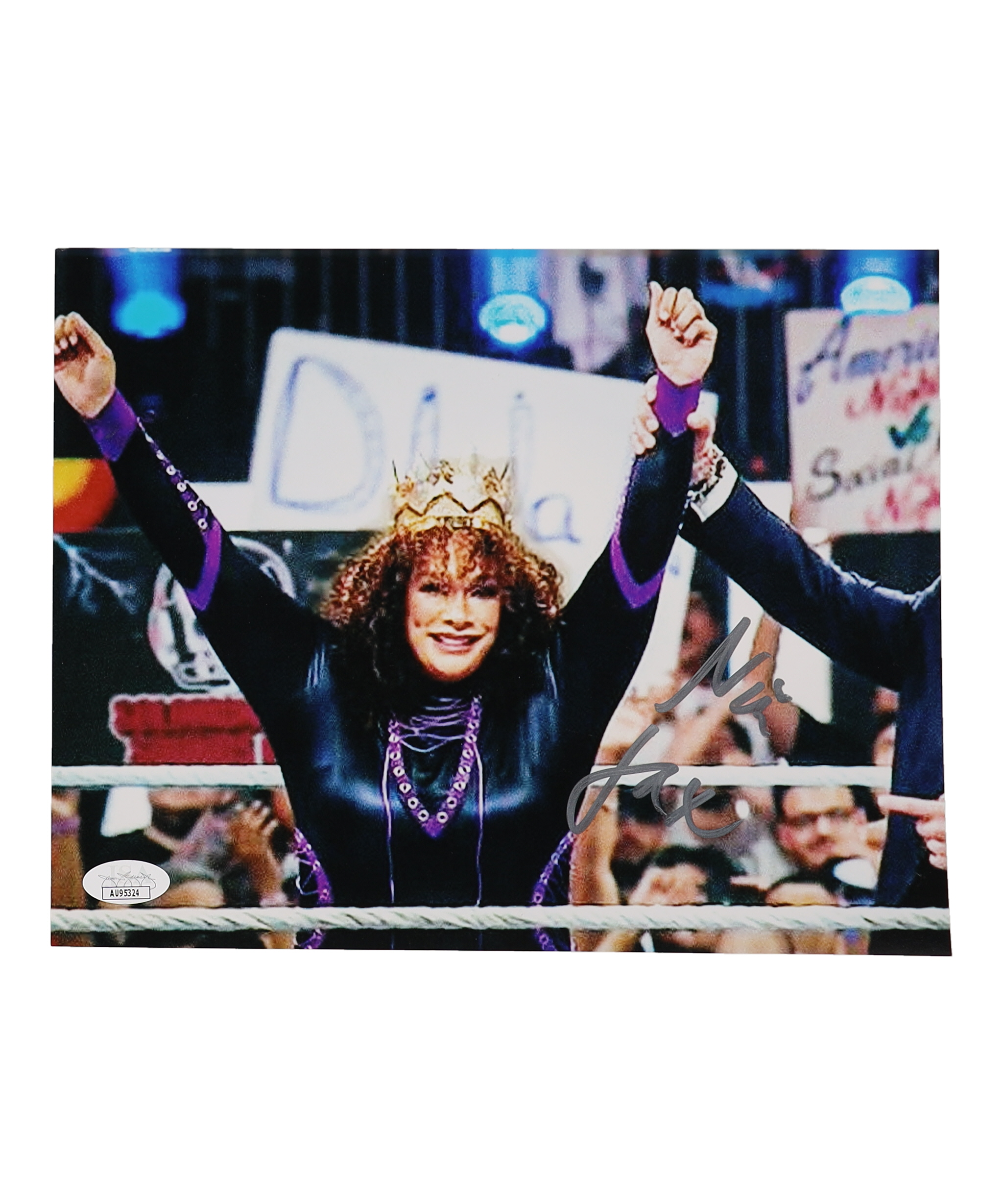 Photo measures 8" x 10" in size. Hand-signed by Nia Jax. Please note, warping on the surface of the photo.