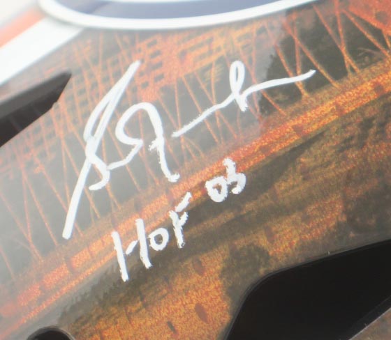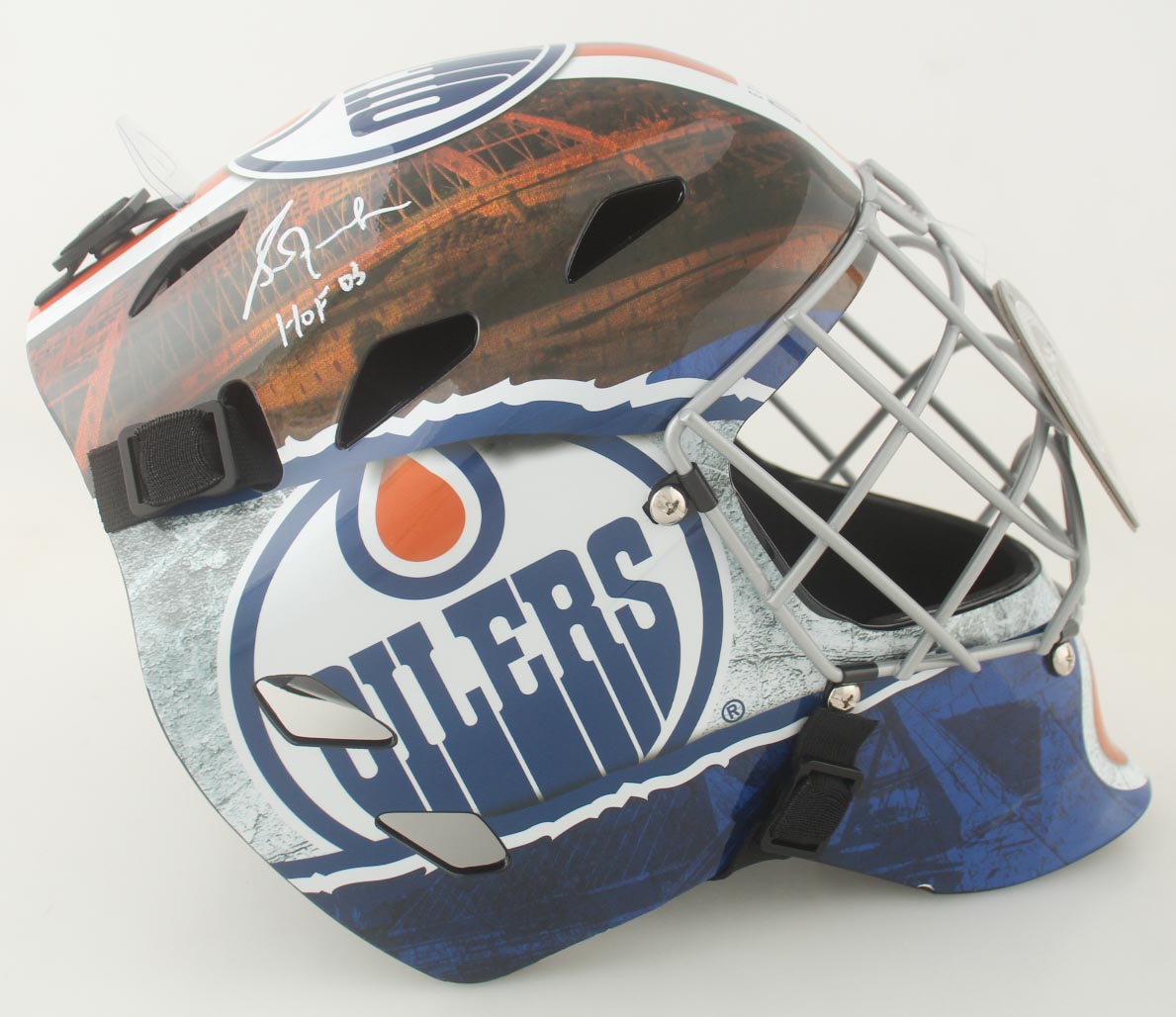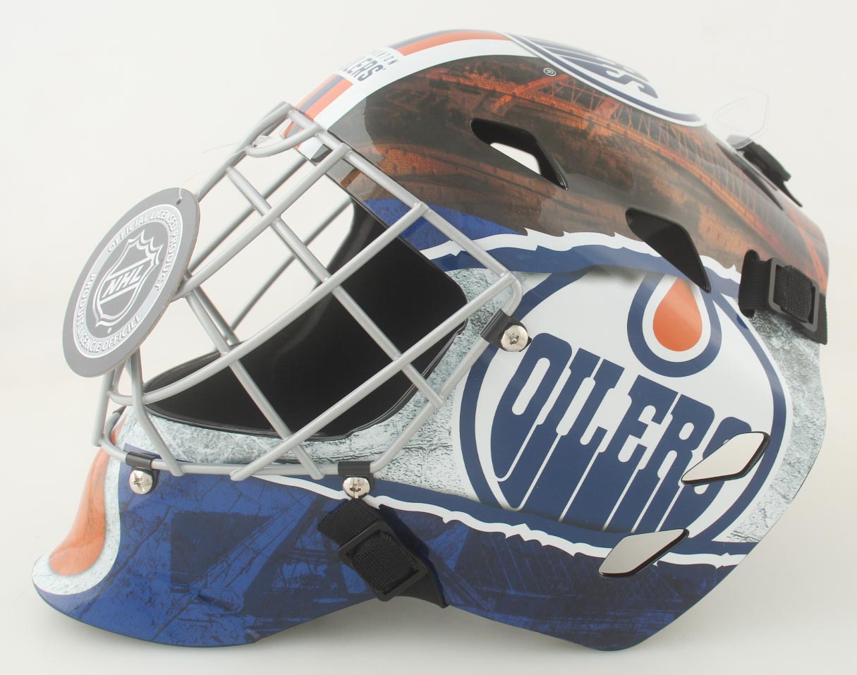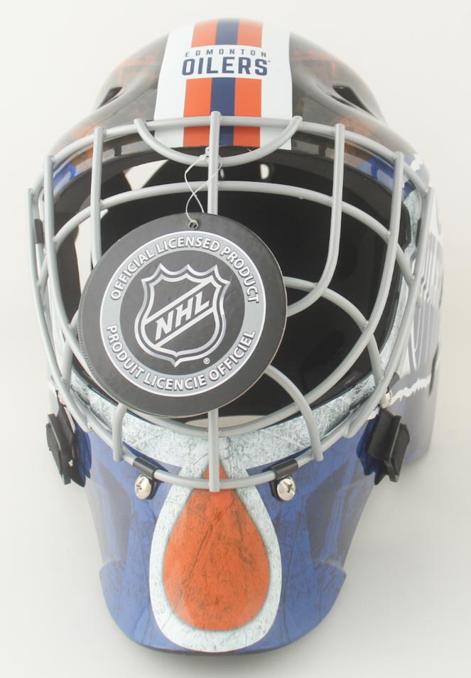 Franklin Edmonton Oilers replica hockey goalie mask. Hand-signed and inscribed by Grant Fuhr (HOF).