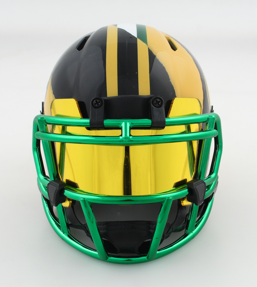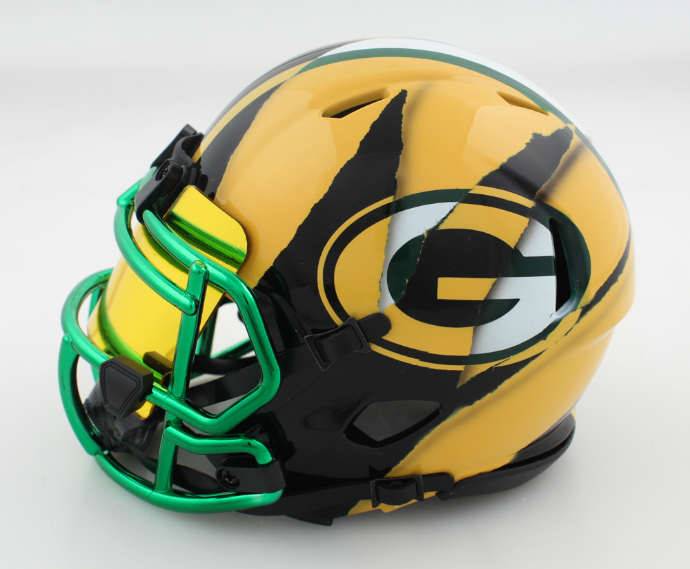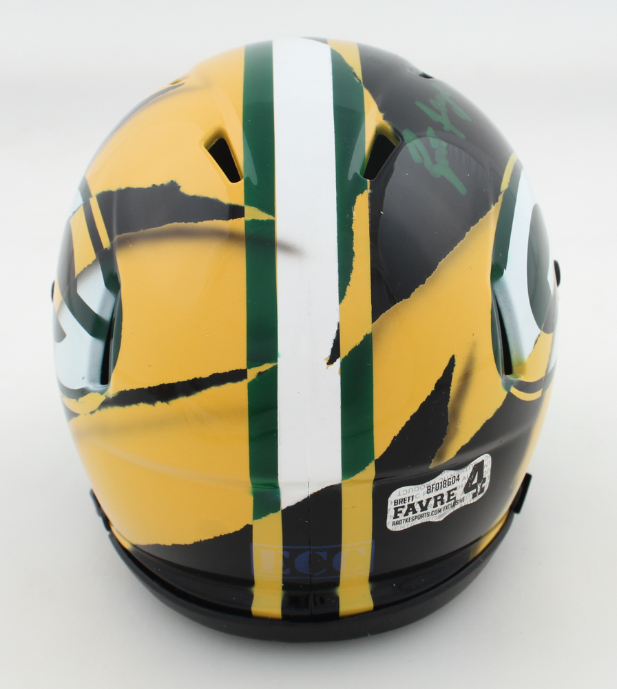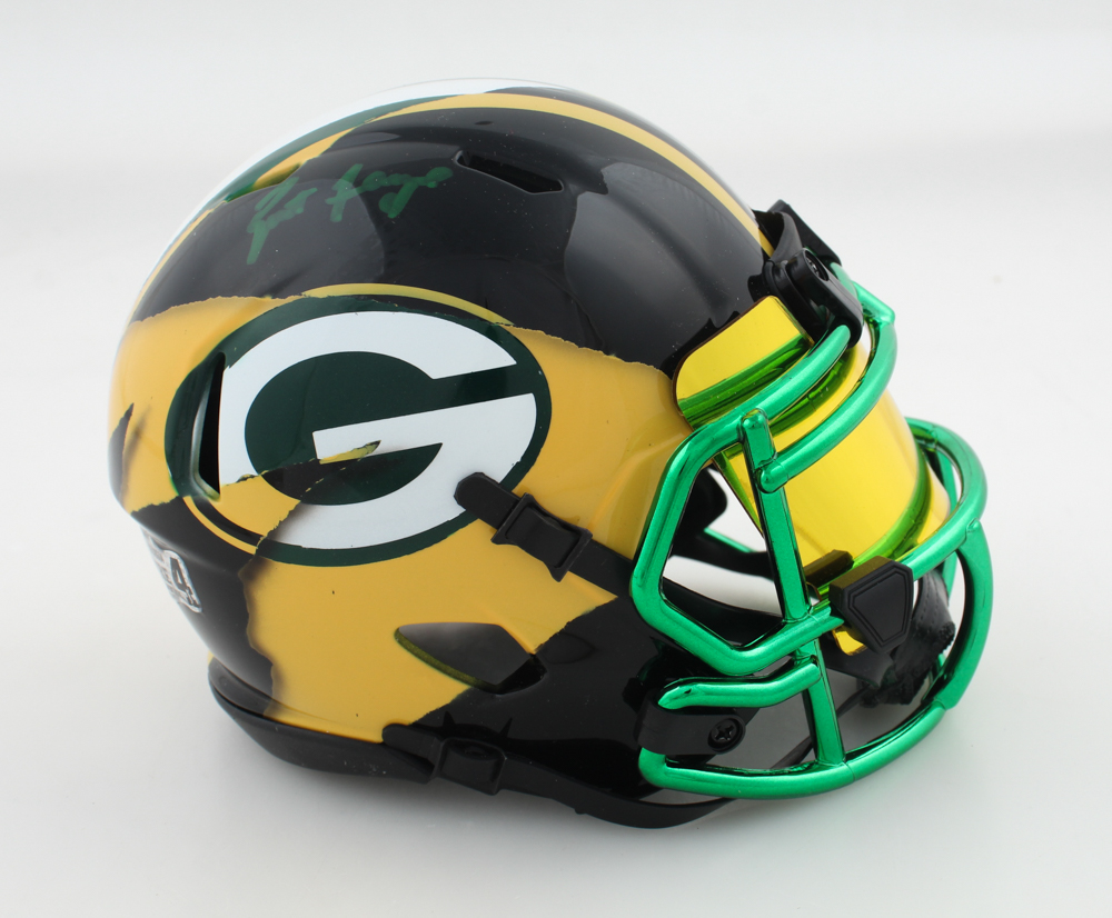 Riddell Green Bay Packers Custom Speed mini helmet with a visor. Hand-signed by Brett Favre (HOF).
