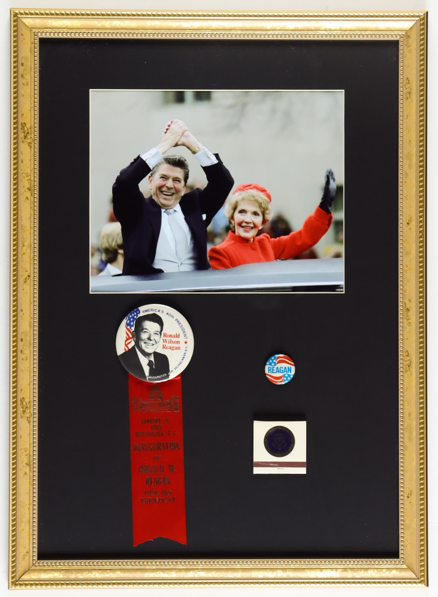 Ronald Reagan 1981 Inauguration Custom Framed Photo with Original Lapel Pin, Reagan Presidential Match Book & Original Campaign Pin