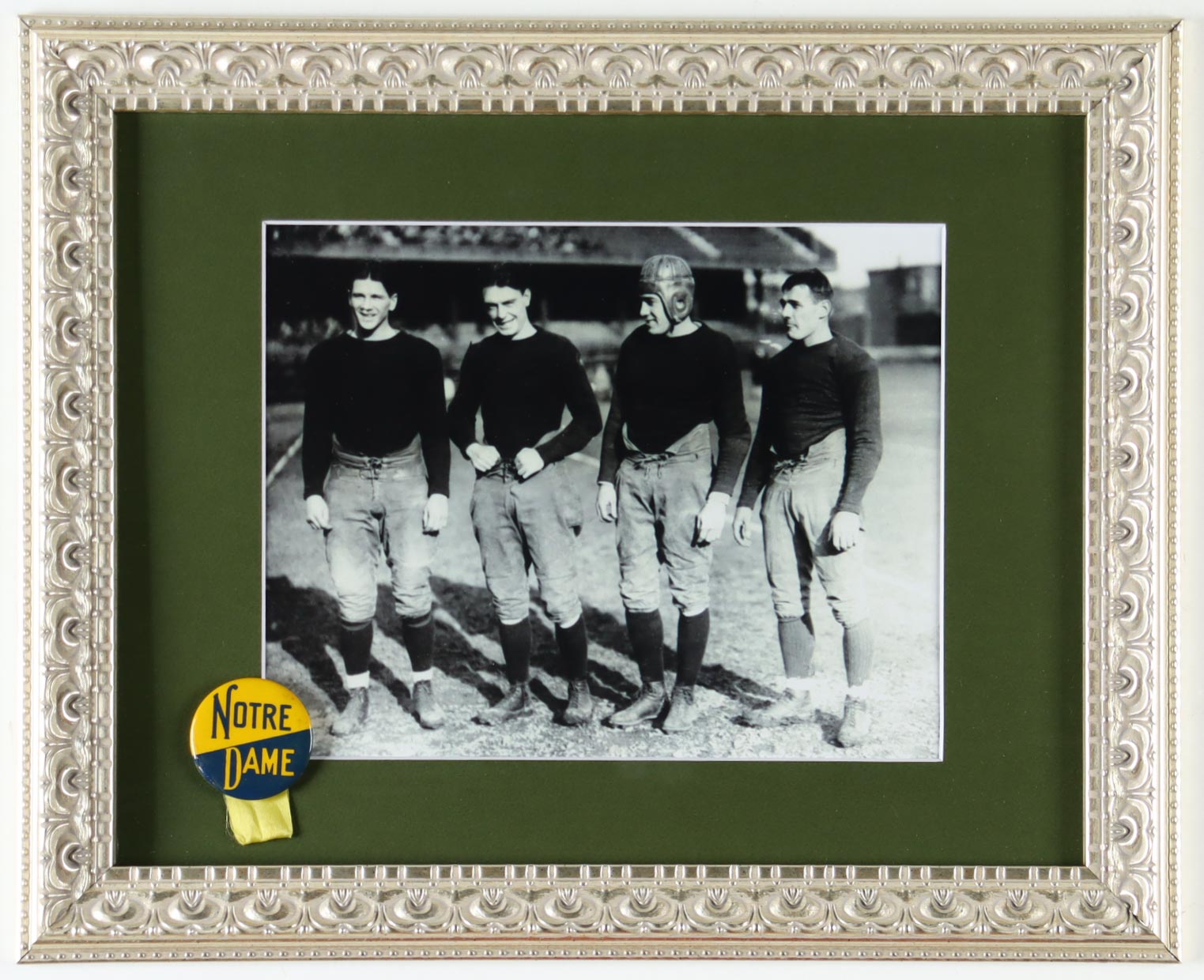 Custom frame measures 13" x 16" in size and features an unsigned photo of the Notre Dame Fighting Irish "The Four Horseman". Along with the frame is a 1965 Fighting Irish lapel pin and ribbon.