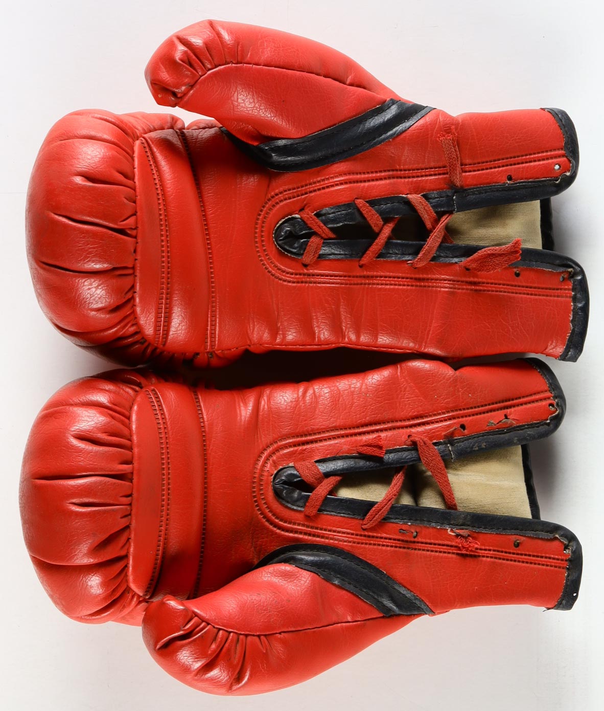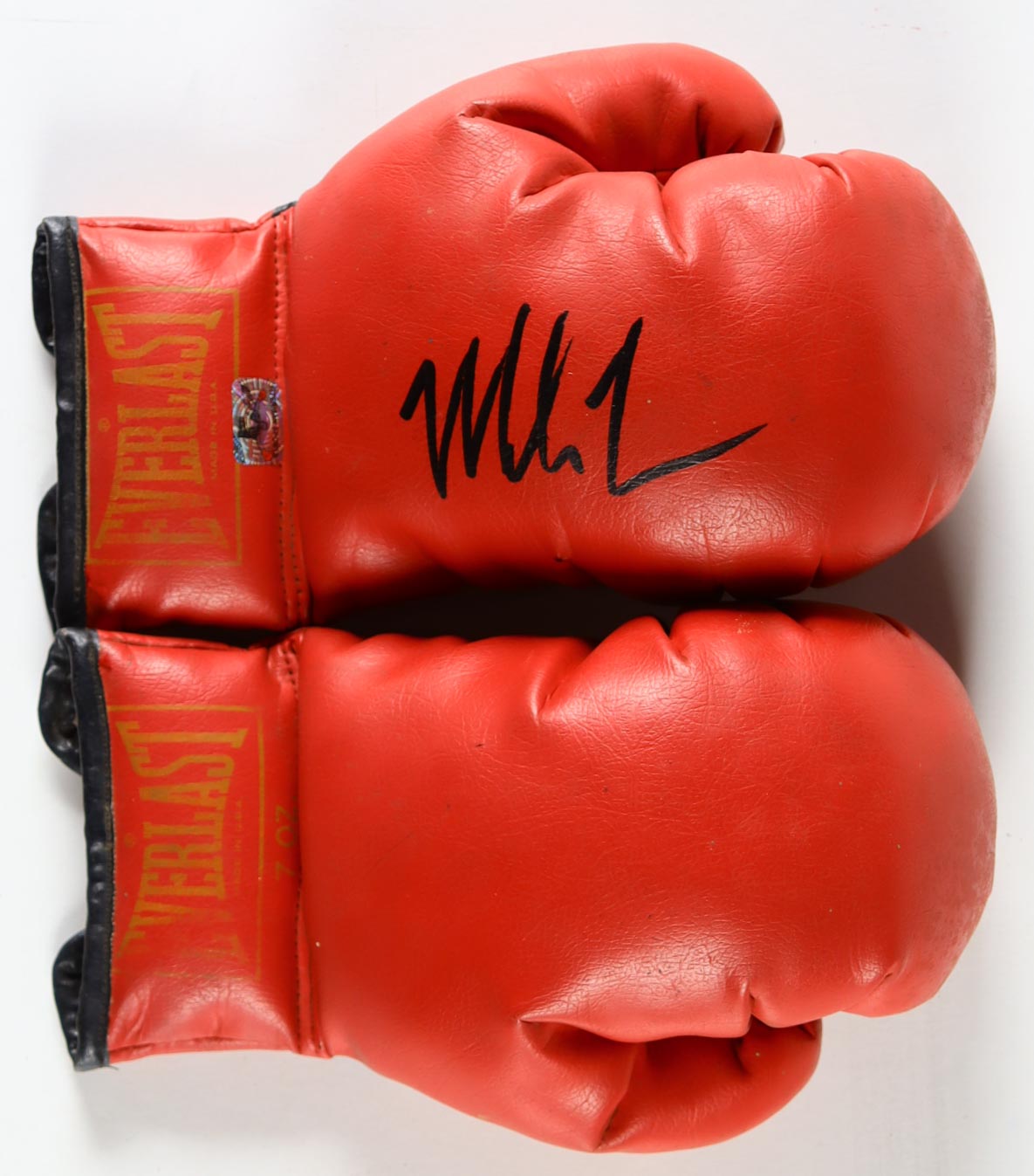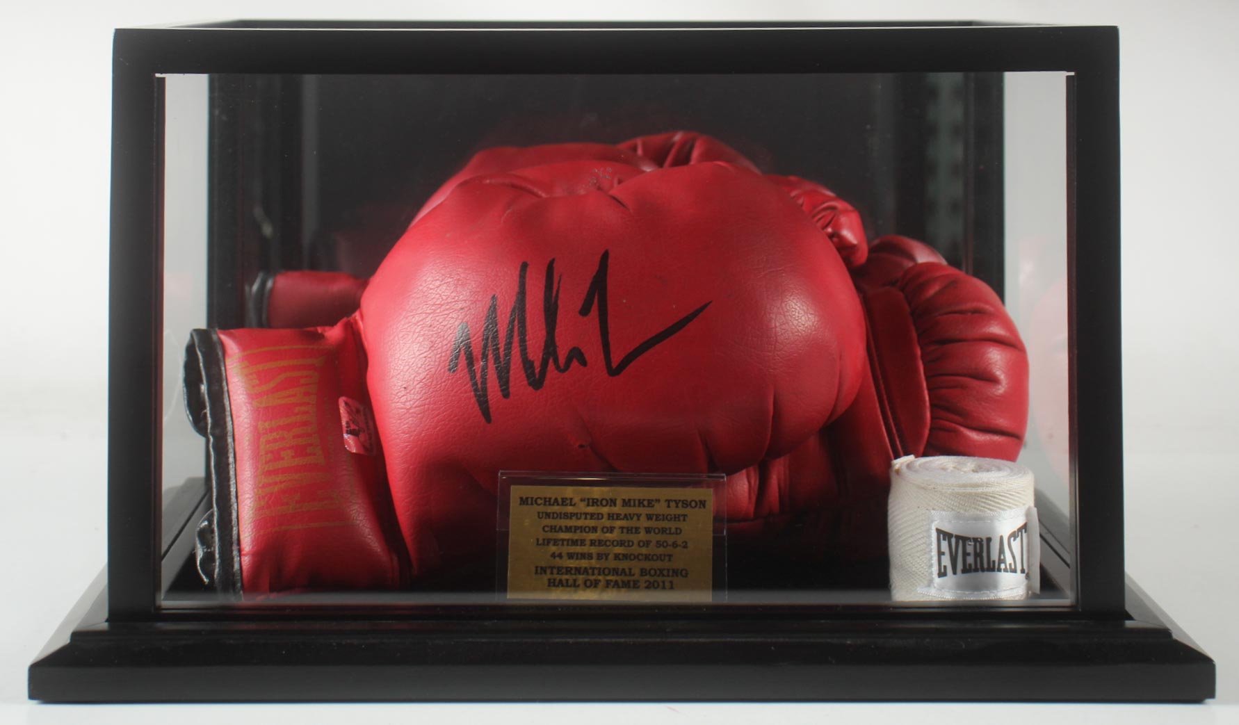 Pair of Everlast boxing gloves. The right glove has been hand-signed by Mike Tyson (HOF). Wrist wraps and display case are included as shown.